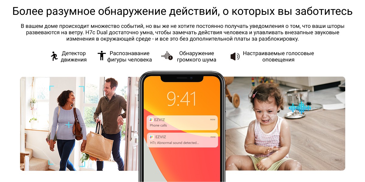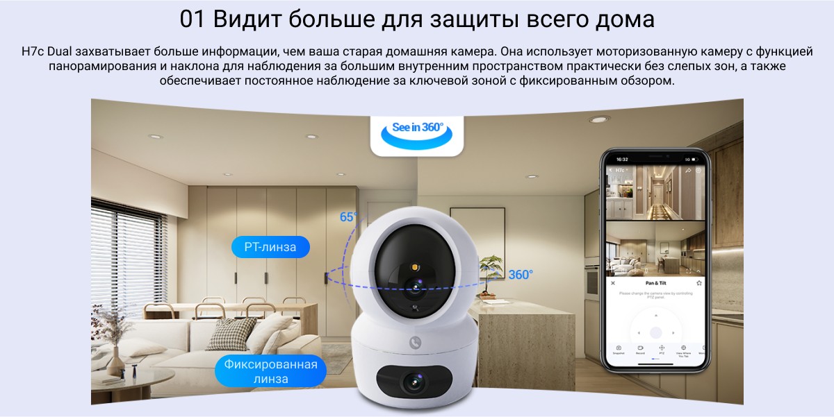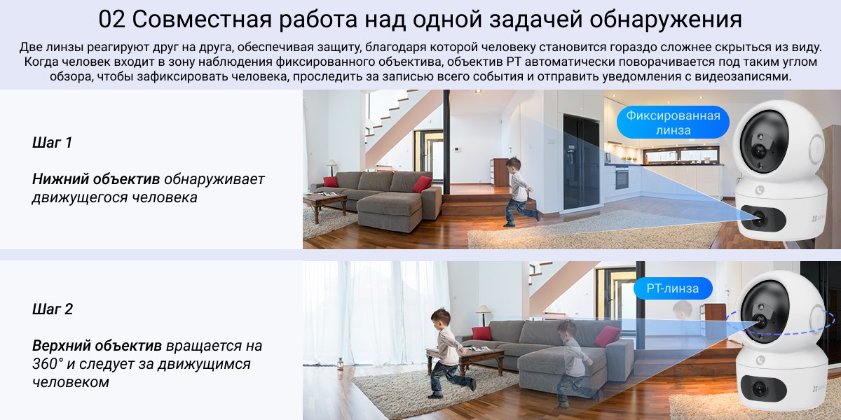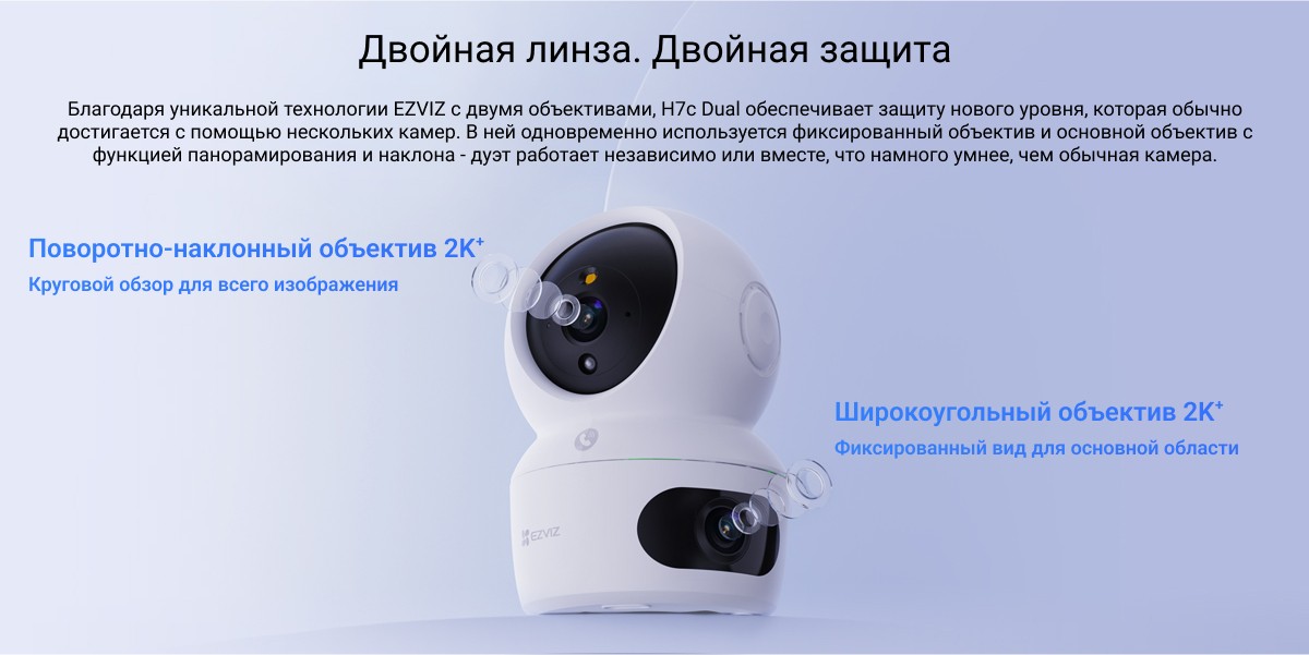 Более широкая и надежная защита благодаря двойным линзам. С камерой EZVIZ H7c Dual вы получите непревзойденный обзор помещения. Используя два мощных объектива для обеспечения полного охвата сверху донизу, камера обеспечивает защиту всего помещения, как никогда раньше. Оснащенная функциями обнаружения движения человека, двустороннего вызова и кристально чистого дневного/ночного видения, она обеспечивает связь с домом из любого места и удваивает чувство безопасности благодаря гораздо более гибким функциям.