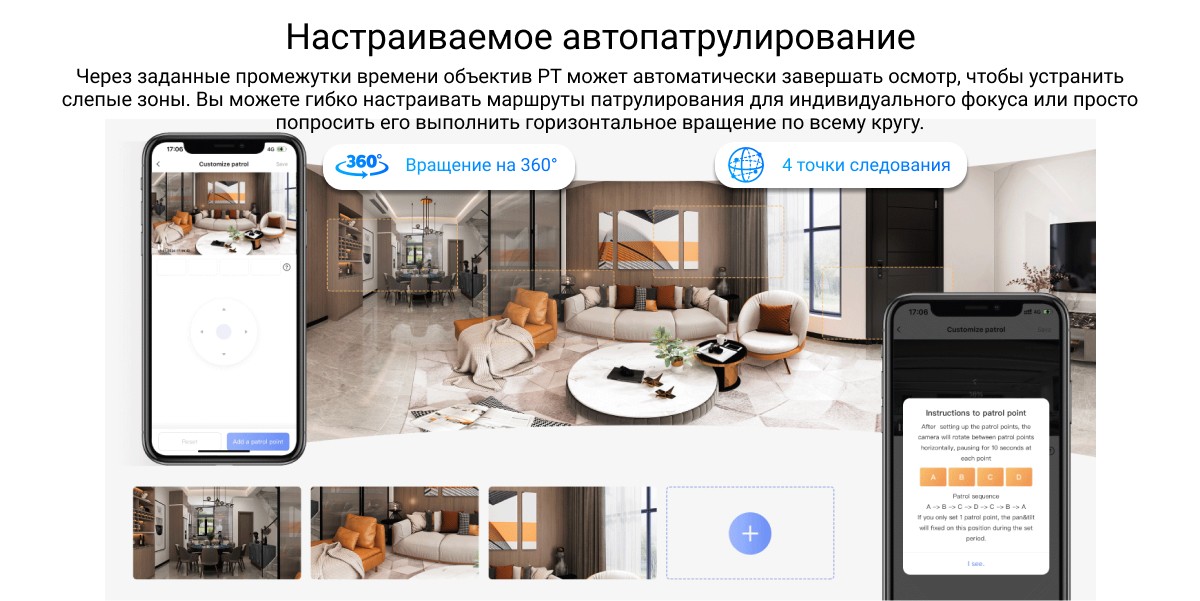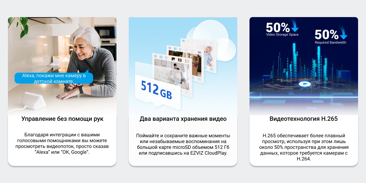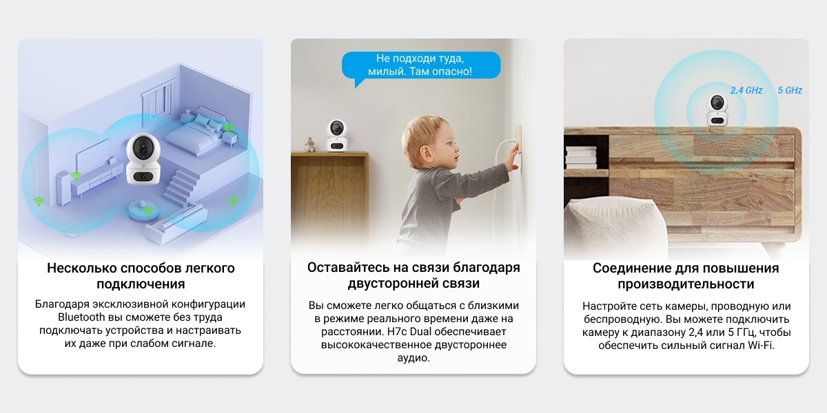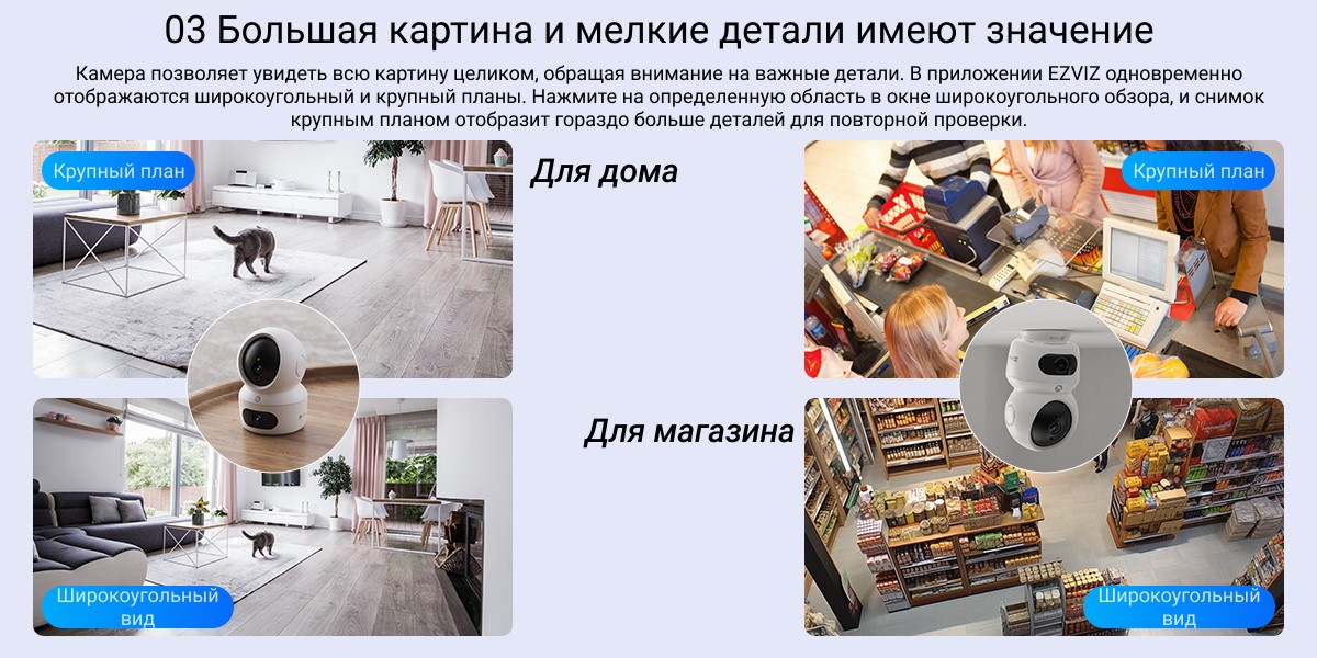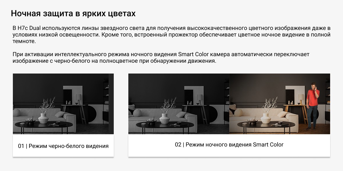 Более широкая и надежная защита благодаря двойным линзам. С камерой EZVIZ H7c Dual вы получите непревзойденный обзор помещения. Используя два мощных объектива для обеспечения полного охвата сверху донизу, камера обеспечивает защиту всего помещения, как никогда раньше. Оснащенная функциями обнаружения движения человека, двустороннего вызова и кристально чистого дневного/ночного видения, она обеспечивает связь с домом из любого места и удваивает чувство безопасности благодаря гораздо более гибким функциям.