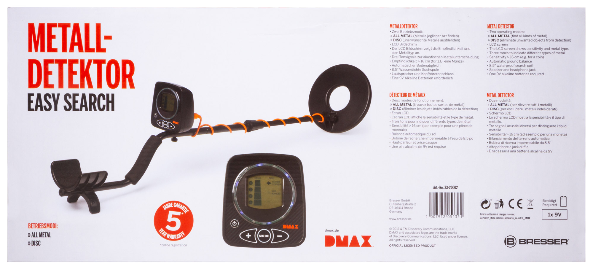 Металлоискатель DMAX Easy Search – это прибор, который может обнаружить металлический объект размером с монету в земле на глубине до 16 см. С его помощью можно искать железо, медь, серебро. Причем чувствительность диска (искателя) можно настроить так, чтобы он реагировал только на определенный металл. При обнаружении объекта металлоискатель издает звуковой сигнал, по тональности которого легко определить вид металла. Обратите внимание: DMAX Easy Search – это не специальный металлоискатель для поиска золота. Он способен обнаружить этот металл, но настроить прибор только на поиск золота невозможно.