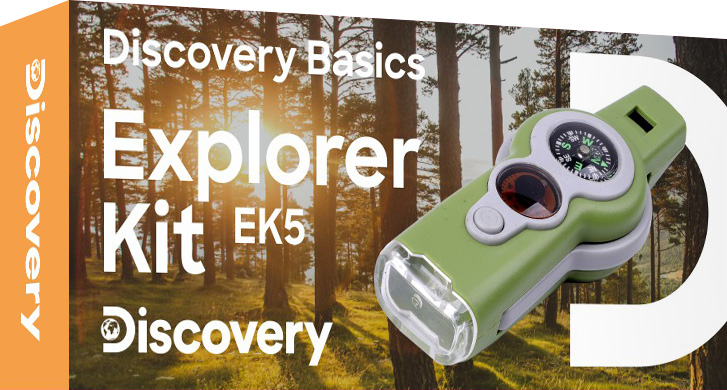 Discovery Basics EK5 – это карманный мультитул с 6 полезными для походов и турпоездок приспособлениями. Свисток служит для подачи громких звуковых сигналов, которые позволяют привлечь к себе внимание к экстренной ситуации. Фонарик пригодится для освещения дороги перед собой в условиях слабой освещенности. Компас поможет определить стороны света. Термометр сообщит о том, насколько благоприятна погода. Также здесь есть лупа для рассматривания мелких объектов и небольшое зеркальце.