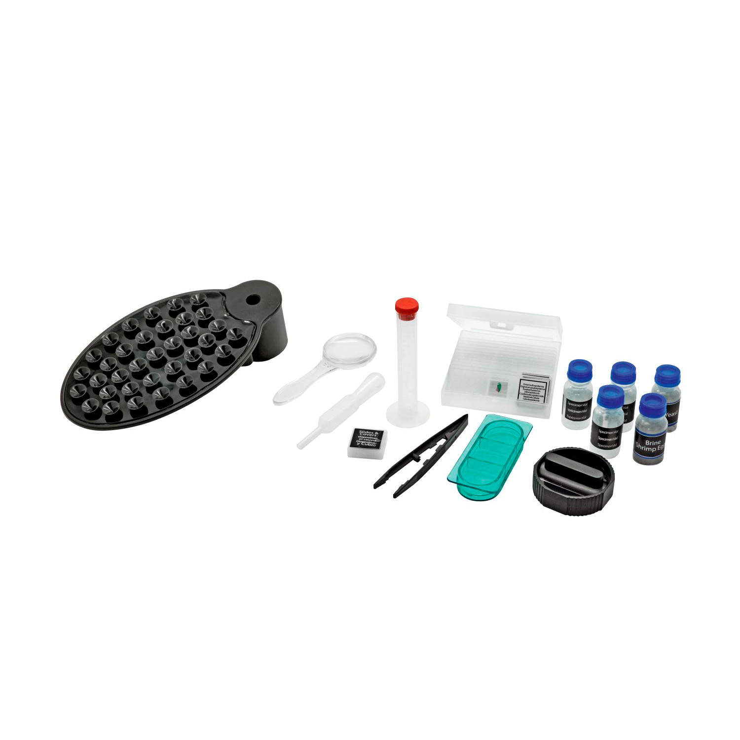 Чтобы избежать трудоемкой подготовительной работы, в набор входит широкий ассортимент аксессуаров, так что вы можете сразу приступить к наблюдениям. Вы можете поместить заранее подготовленные образцы непосредственно под микроскоп и понаблюдать за их содержимым. В качестве альтернативы вы также можете приготовить свои собственные образцы с помощью прилагаемого набора инструментов.
