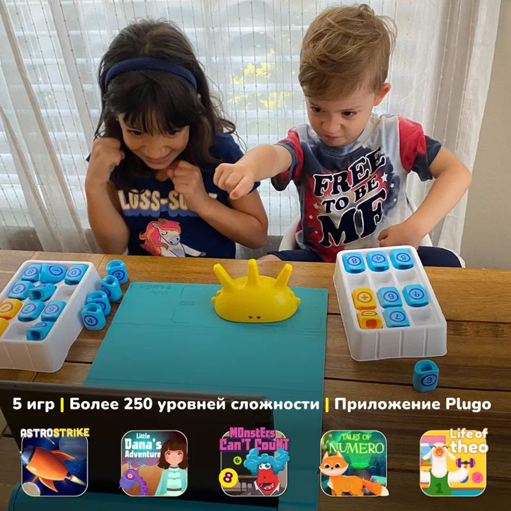 Мобильное приложение Plugo с дополненной реальностью содержит 5 ярких интересных игр, разделенных на 250 уровней сложности, – для развития вычислительных навыков в комфортном для ребенка темпе. Следуя указаниям на экране, ребенок будет воспроизводить нужные действия и давать ответы не на планшете, а с помощью специальной подставки, на которую нужно надевать цилиндры с соответствующими цифрами.