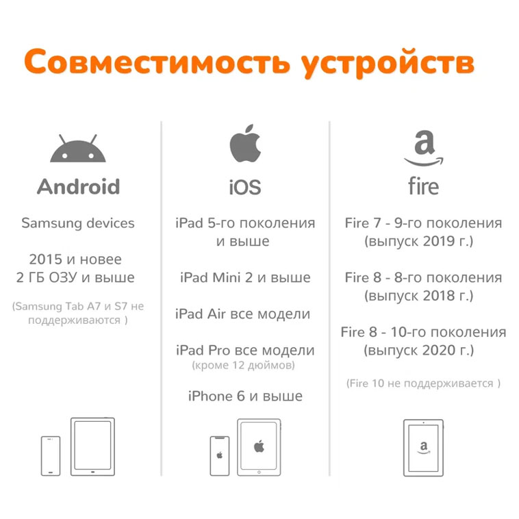 Приложение поддерживается устройствами Samsung (от 2015 года, кроме моделей Tab A7 и S7), всеми моделями iPhone от 6 и выше, iPad Air и iPad Pro (кроме 12 дюймов), iPad (начиная с 5 поколения) и iPad Mini (от 2 и выше), Fire 7 (9 поколения, выпуск 2019 г.), Fire 8 (8 поколения, выпуск 2018 г. и 10 поколения, выпуск 2020 г.). Fire 10 приложение не поддерживает.