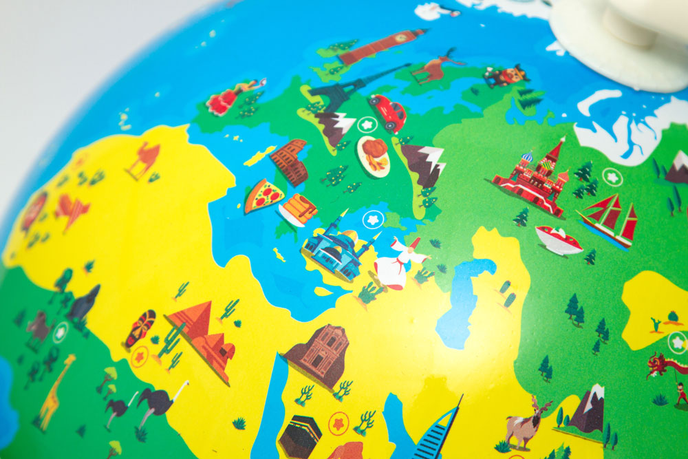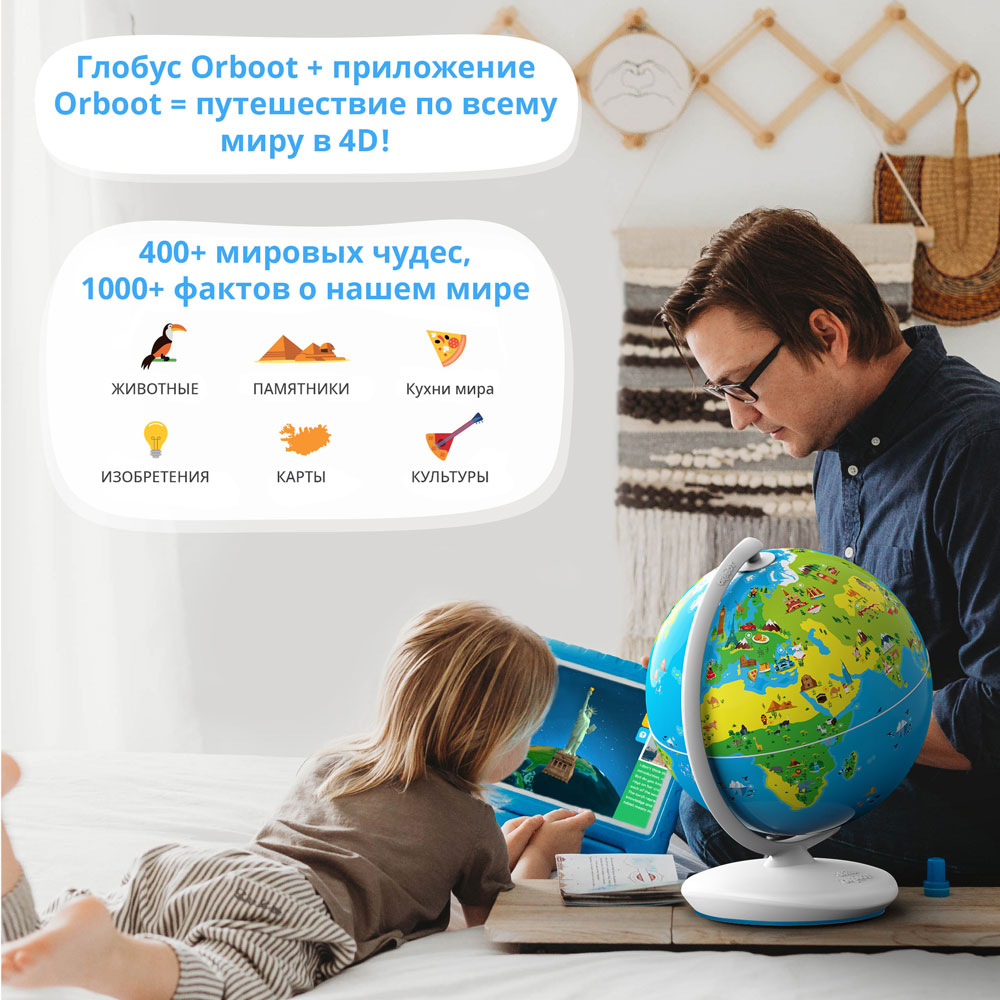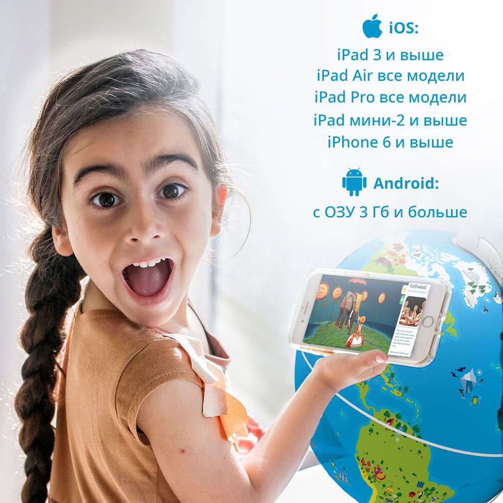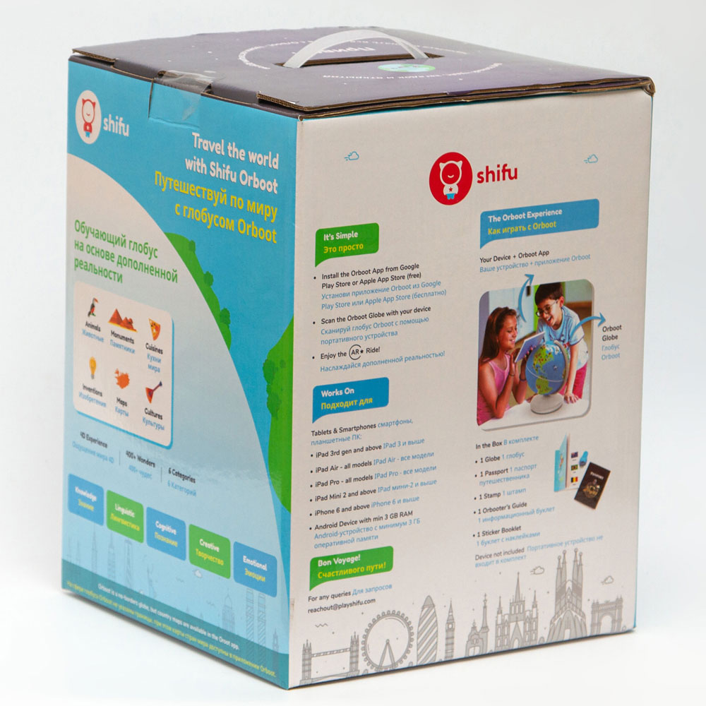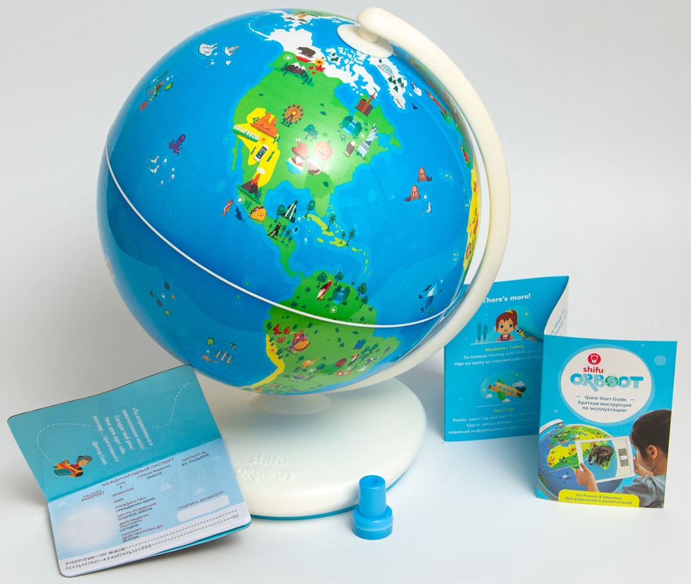 Приложение для работы с глобусом Shifu Orboot версия 2.0 русифицировано. Оно содержит огромный объем информации: более 1000 удивительных фактов о мире и его чудесах, а также викторины для закрепления изученного материала. Приложение можно установить на Android и все модели iPhone от 6 и выше, iPad Air и iPad Pro, iPad (начиная с 3 поколения) и iPad Mini (от 2 и выше). Глобус дополнен комплектом наклеек, штампом и паспортом путешественника, чтобы фиксировать в нем исследованные страны.