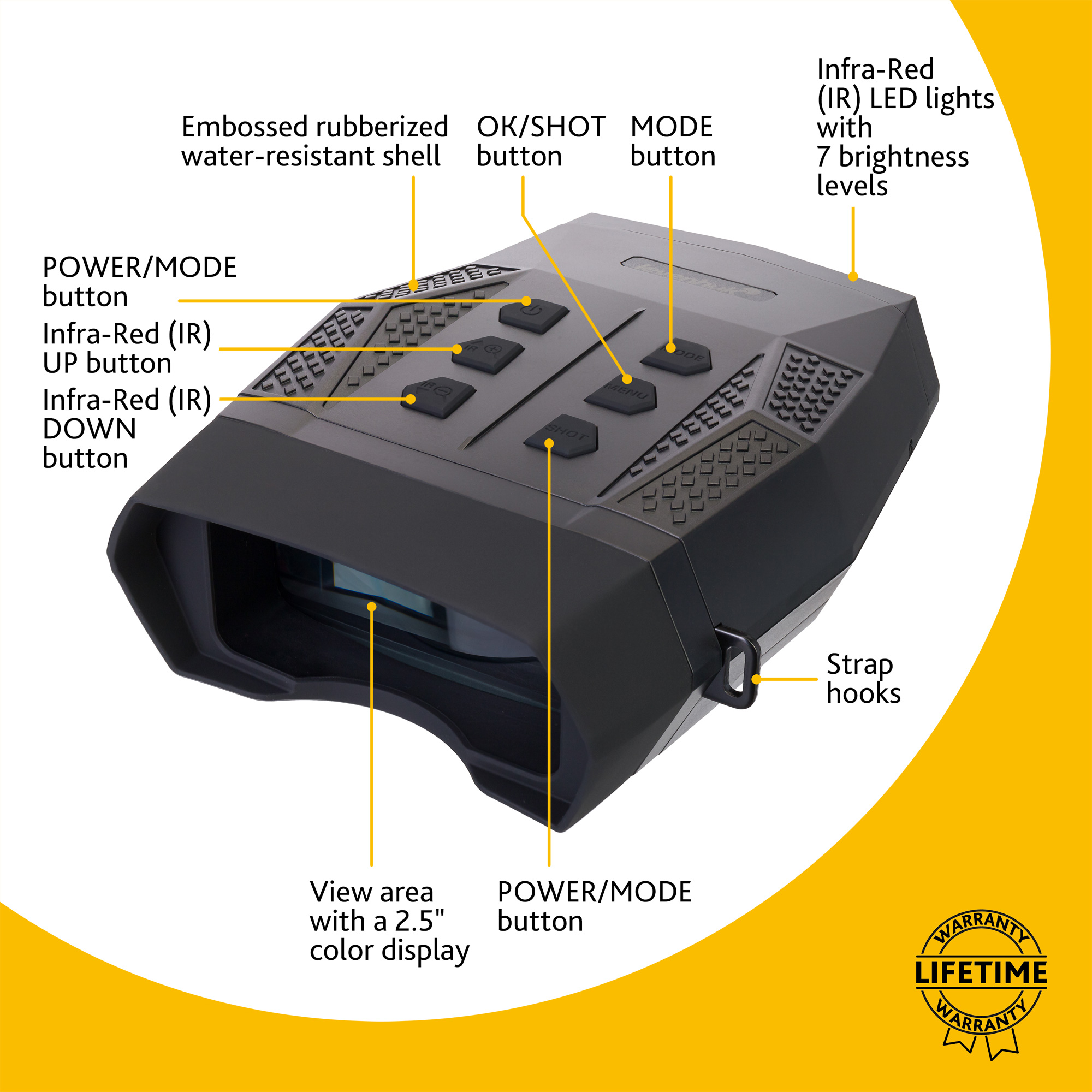 Эта модель ПНВ в ночное время позволяет хорошо различать цели на удалении до 400 метров. Встроенная подсветка имеет регулировку яркости, поэтому ее легко настроить под любые условия освещенности. Подсветка безопасна для зрения и невидима для окружающих – как людей, так и животных. Днем бинокль может фокусироваться на объектах, удаленных на 1 метр и более. И так как оптика сделана из стекла и дополнена покрытием на основе диоксида кремния, ПНВ создает четкое и контрастное изображение, позволяя ясно различать совсем мелкие детали. Прибор может создавать цветное, черно-белое, ярко-зеленое изображение или изображение с эффектом цветной пленки. В ночном режиме цветное изображение не доступно.
