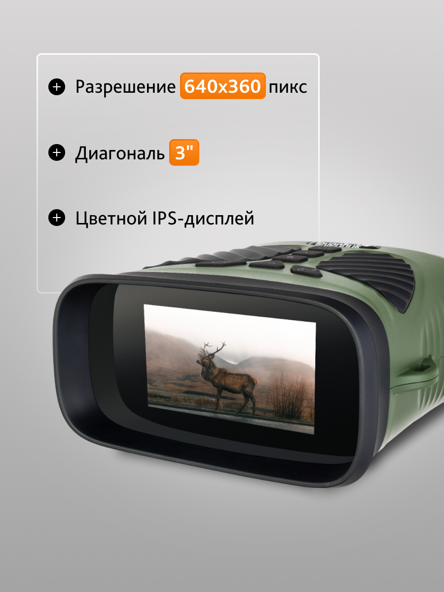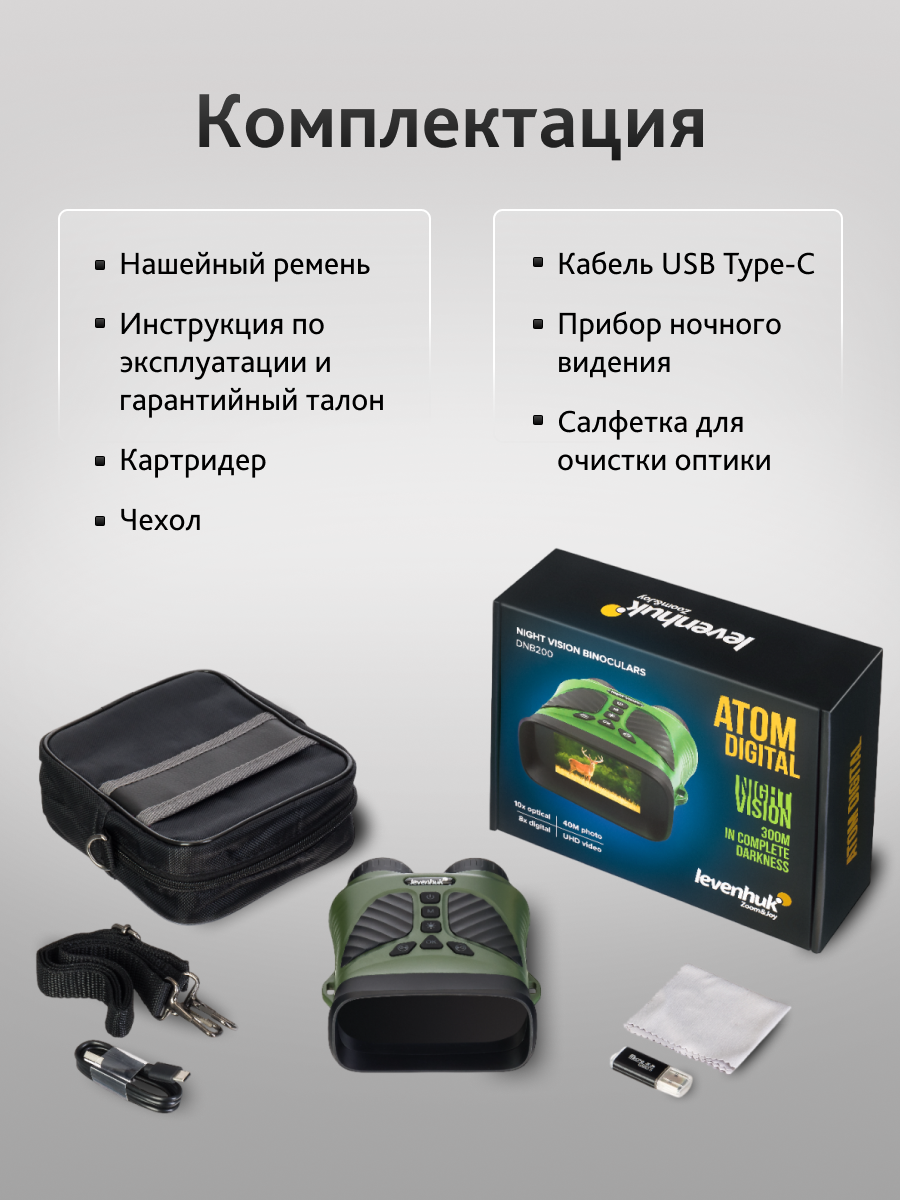 Levenhuk Atom Digital DNB200 – это бинокль ночного видения с цифровым преобразователем, мощной ИК-подсветкой и встроенным дисплеем с высоким разрешением. С помощью этого прибора можно с комфортом вести наблюдения и съемку в любых условиях освещенности, комбинируя оптическое приближение картинки и цифровой зум, настраиваемый в пределах 1–8х. Бинокль хорошо проявит себя на дневных и ночных охотничьих вылазках, пригодится для разведывания незнакомых территорий, при слежении за местностью и в поисково-спасательных работах. В дневное время картинка цветная, ночью – черно-белая.