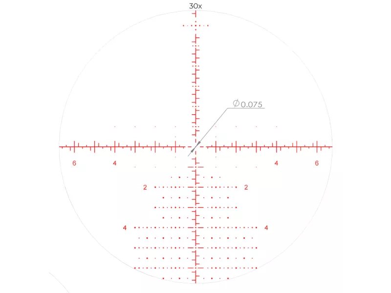 Прицельная сетка AM530 расположена в первой фокальной плоскости (FFP) и изменяет свой масштаб согласно установленной кратности. T — образное перекрестие не препятствует обзору и позволяет быстро захватить цель на минимальной кратности 5х. Выставив увеличение в диапазоне от 15х до 30х, стрелок получает возможность оперативно вносить поправки с помощью информативной разметке по горизонтали и вертикальной «елочки». Наличие сразу 11 уровней подсветки исключает трудности адаптации к различным условиям освещения и сложному фону локации. Промежуточные «нулевые» положения барабана позволяют одним движение отключить подсветку и моментально вернуться к предыдущему уровню яркости.