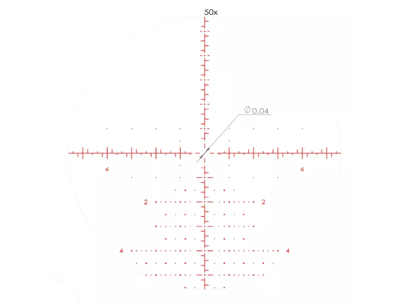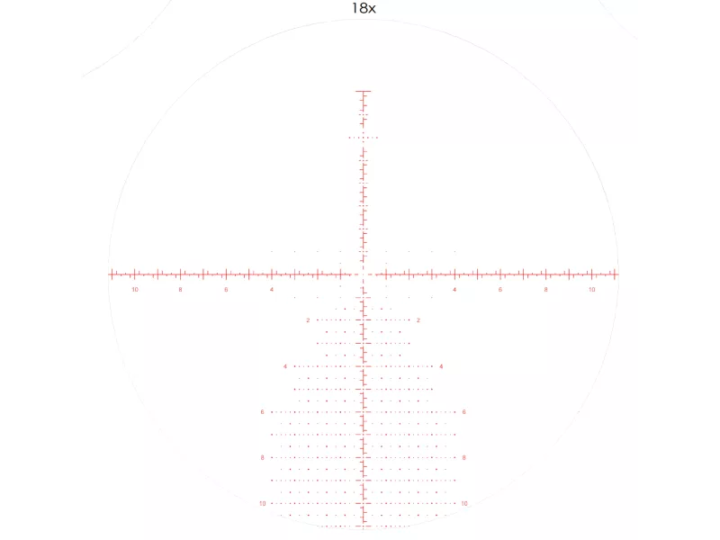 Прицельная сетка AM650 отлично подходит для дальнобойной охоты в горах и высокоточных спортивных дисциплин. Расположенная в первой фокальной плоскости, сетка изменяет свой масштаб согласно кратности. Ненавязчивое перекрестие не препятствует обзору и позволяет быстро захватывать цель на минимальной кратности 6х. Выставив кратность от 18 до 50х, стрелок получает доступ к разметке для оперативного ввода поправок по любой из осей.