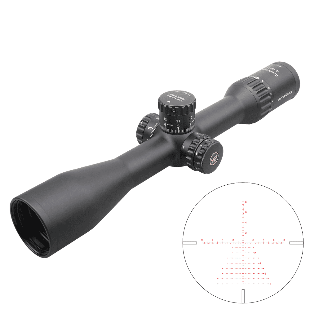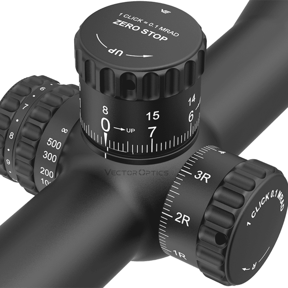 Тактические барабанчики обладают диапазоном регулировки по вертикали и горизонтали в 32 MIL с ценой клика в 1/10 0,1MIL. Каждый клик сопровождается четким и отчетливо различимым щелчком, что помогает производить настройку на слух. Вертикальный барабан снабжен системой Zero-Stop, позволяя моментально вернуться к первоначальным значениям пристрелки.