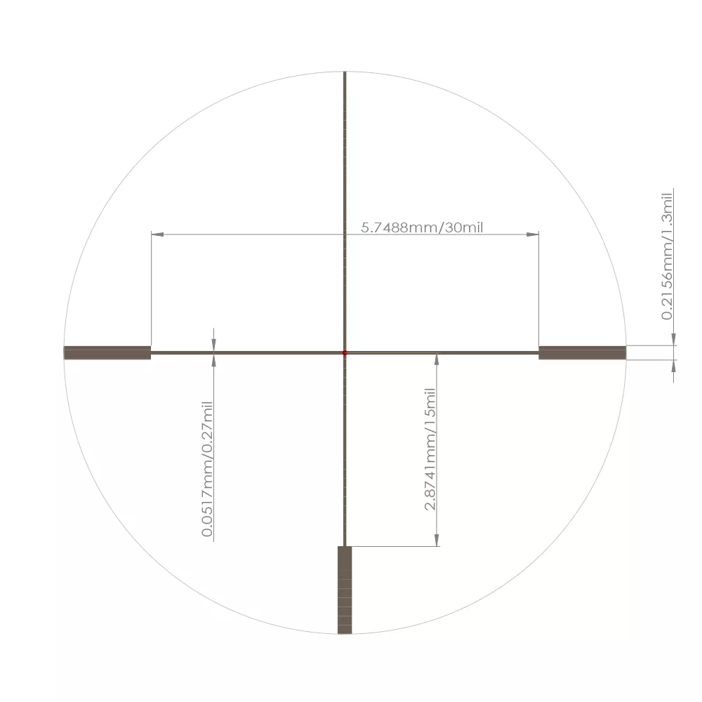 Минималистичная прицельная сетка L4A представлена тонкими линиями по обеим осям, а также характерными для загонных прицелов «пеньками». Благодаря расположению во второй фокальной плоскости, сетка сохраняет свой масштаб при любом установленном увеличении и не перекрывает малые цели.