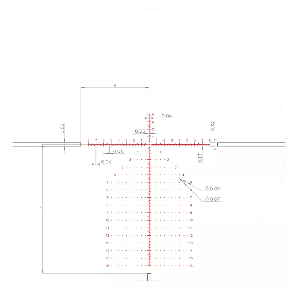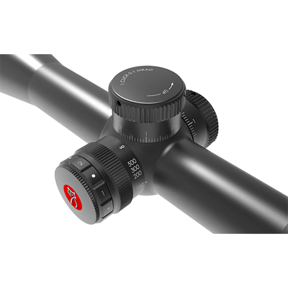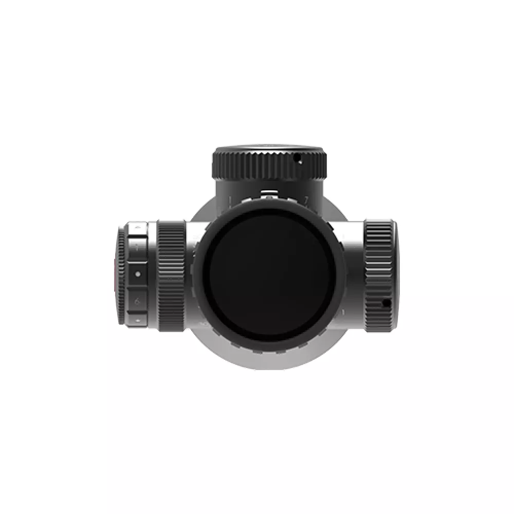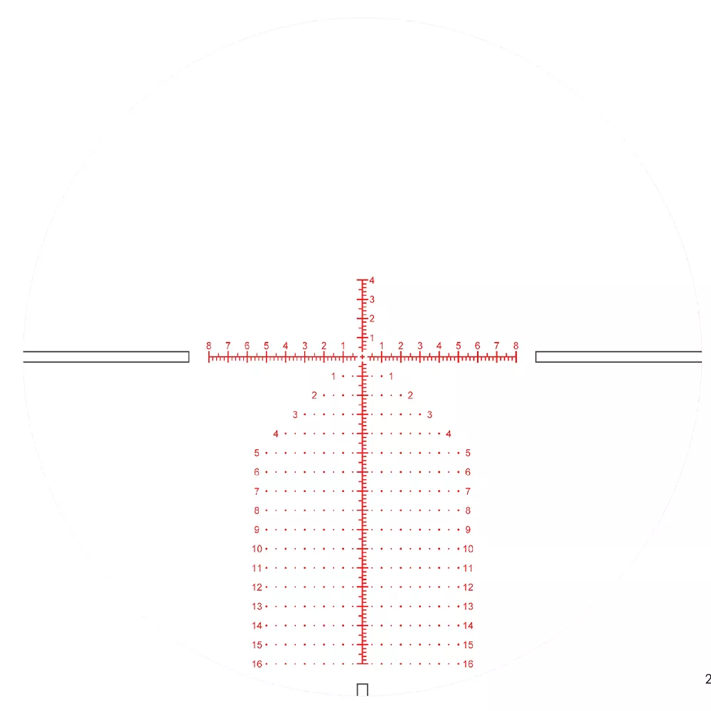Прицельная сетка расположена в фокальной плоскости объектива (FFP), что позволяет масштабировать размеры сетки пропорционально изменению увеличения прицела. Это важно для определения дистанции до цели при стрельбе на различных кратностях. Линии центрального перекрестия сетки имеют минимальную толщину, что обеспечивает точность при стрельбе по малоразмерным целям на больших дистанциях. Прицел также обладает 6 уровнями регулировки подсветки сетки, позволяющими настроить интенсивность под различные условия освещения и обеспечить легкую читаемость марки.