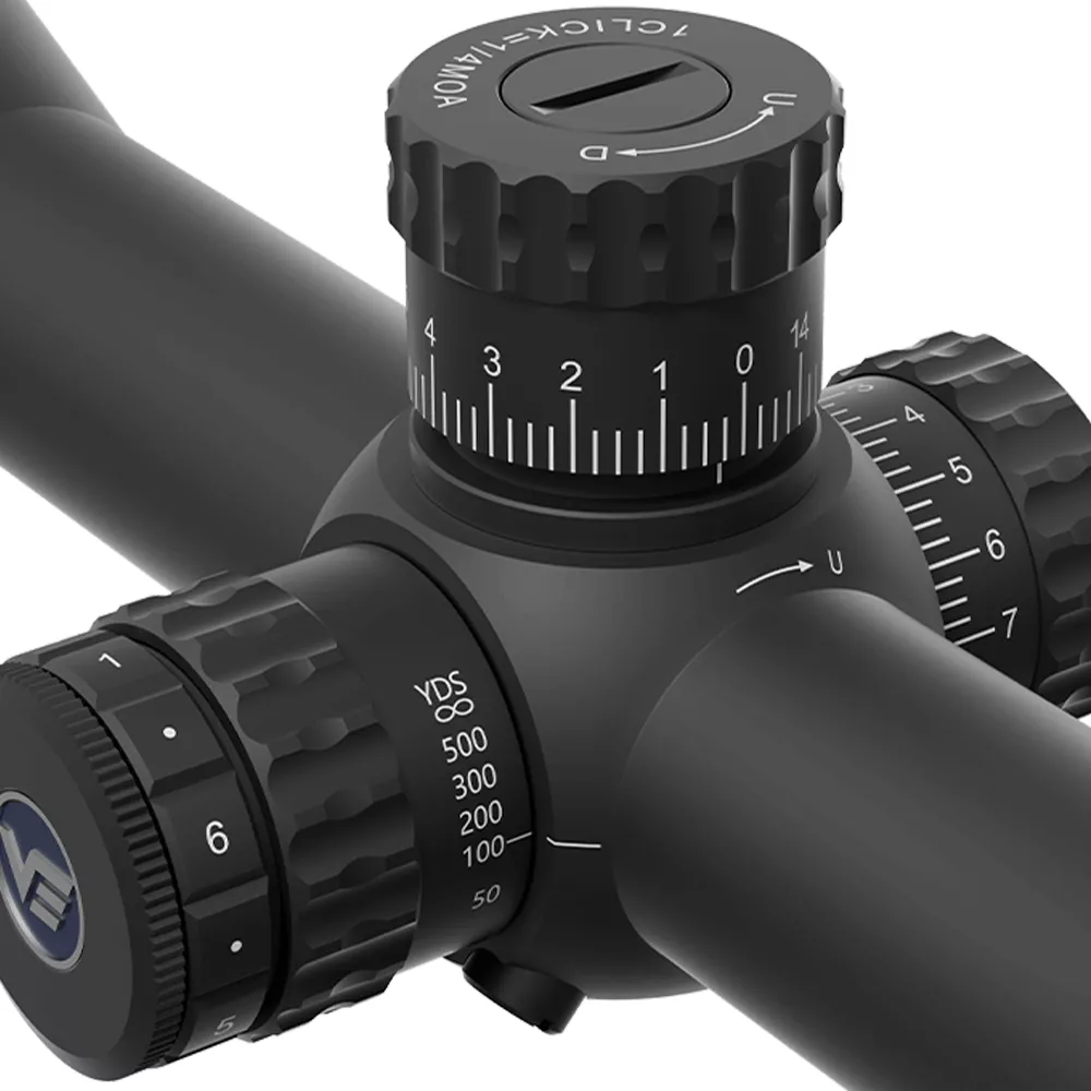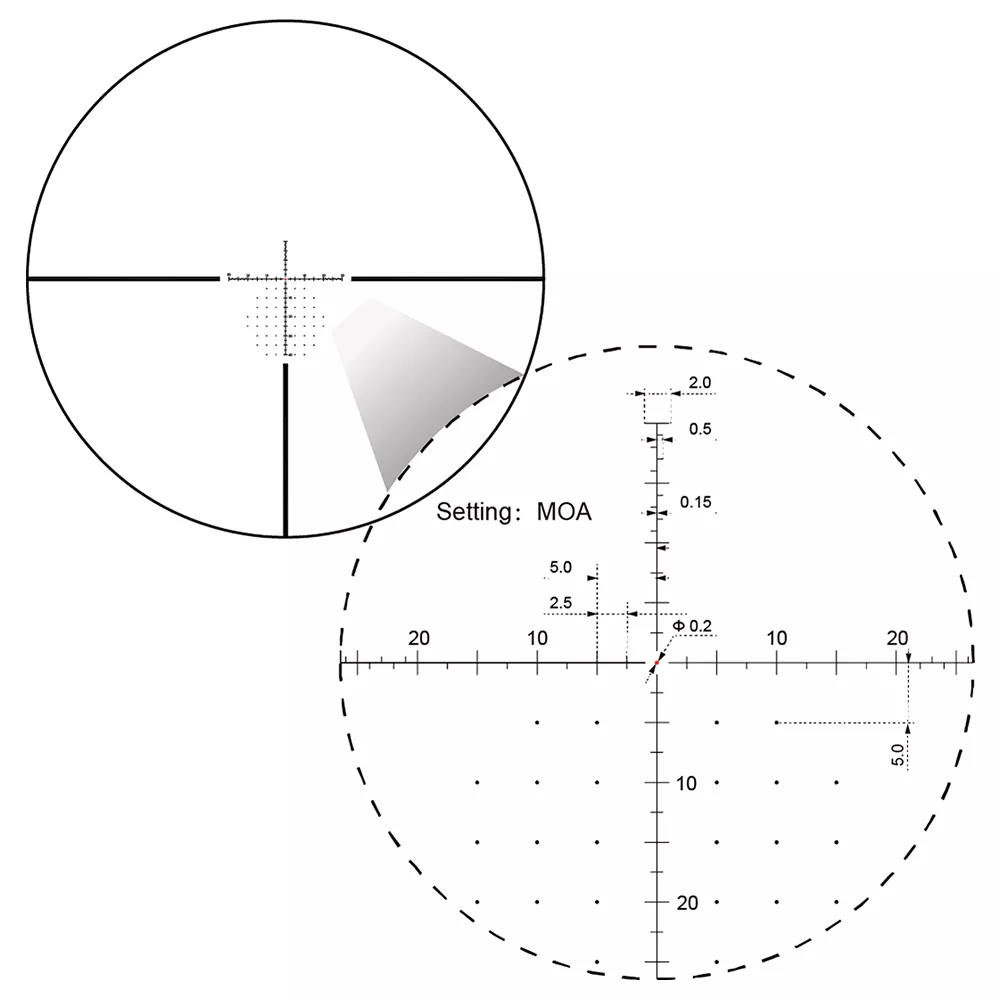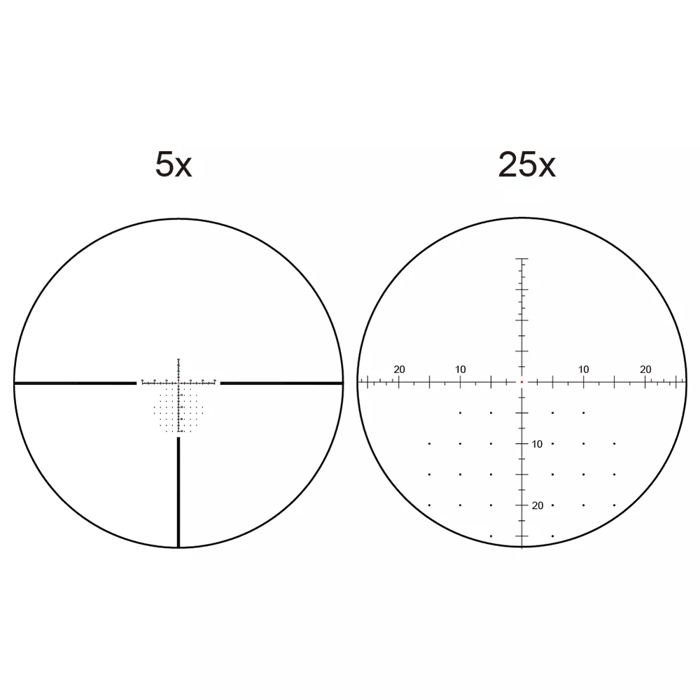 Ввиду расположения в первой фокальной плоскости, прицельная сетка VSE-5 MOA изменяет свой масштаб согласно установленной кратности, что очень удобно при стрельбе на сверхдальних дистанциях. Разметка по обеим осям дает возможность вводить поправки прямо во время стрельбы, не прибегая к настройке барабанами юстировки.