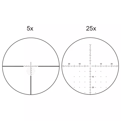 Ввиду расположения в первой фокальной плоскости, прицельная сетка VSE-5 MOA изменяет свой масштаб согласно установленной кратности, что очень удобно при стрельбе на сверхдальних дистанциях. Разметка по обеим осям дает возможность вводить поправки прямо во время стрельбы, не прибегая к настройке барабанами юстировки.