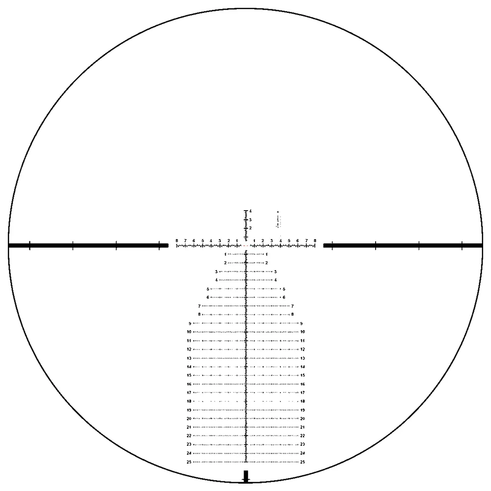Прицельная сетка VEC-MBR выгравирована на стекле в первой фокальной плоскости, благодаря чему изменяет свой масштаб пропорционально кратности. Вертикальная и горизонтальная разметка позволяет оперативно вносить поправки при стрельбе выносом. Для тонкой подстройки под конкретные условия освещения предусмотрено 6 режимов яркости подсветки центральной марки.