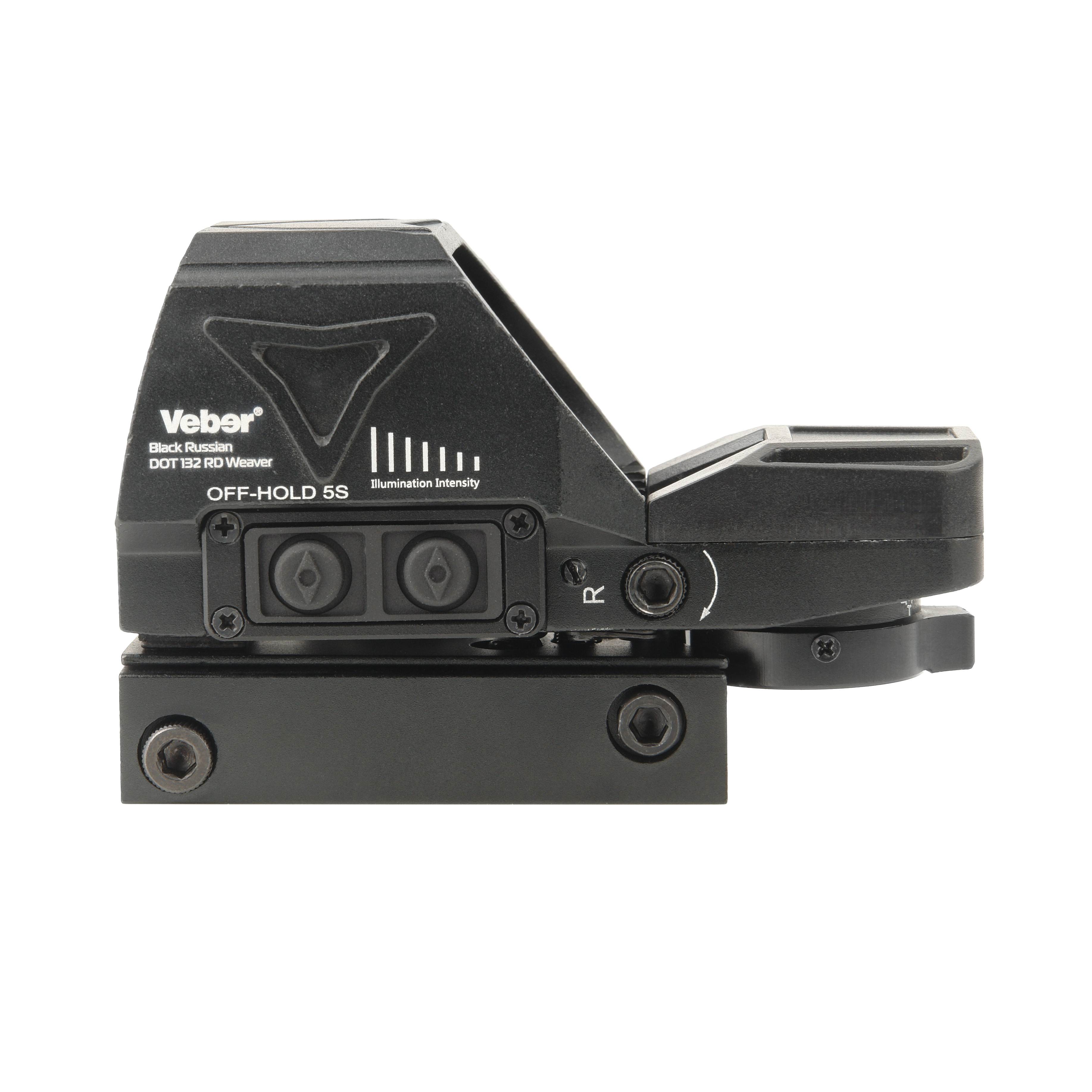 Корпус соединен с креплением для установки на планку Weaver длиной от 22мм. Также выпускается модификация прицела Veber Black Russian DOT 132 RD DVT11 для установки на оружие с планкой «ласточкин хвост» 11 мм.