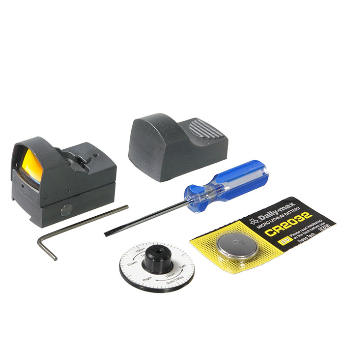 Прицел оборудован световым датчиком, и комплектуется защитным колпачком. Включение прицела происходит автоматически при снятии колпачка. Для точной регулировки положения прицельной марки по высоте и по горизонту в комплект входят шестигранный ключ и отвертка. Как производить эту процедуру, подробно описано в инструкции.
