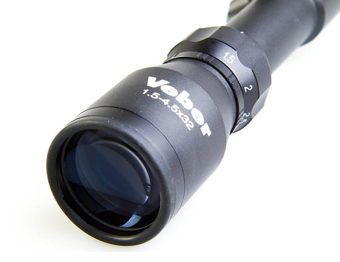 Плавное увеличение от 1,5х до 4,5х, посадочный диаметр 25,4 мм. Обрезиненное кольцо диоптрийной подстройки. Щелчки механизма поправок очень четкие и слышные. Металлические защитные колпачки механизма ввода поправок упираются в резиновые прокладки на корпусе (для исключения попадания влаги во внутрь корпуса).