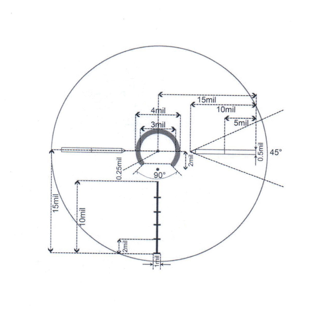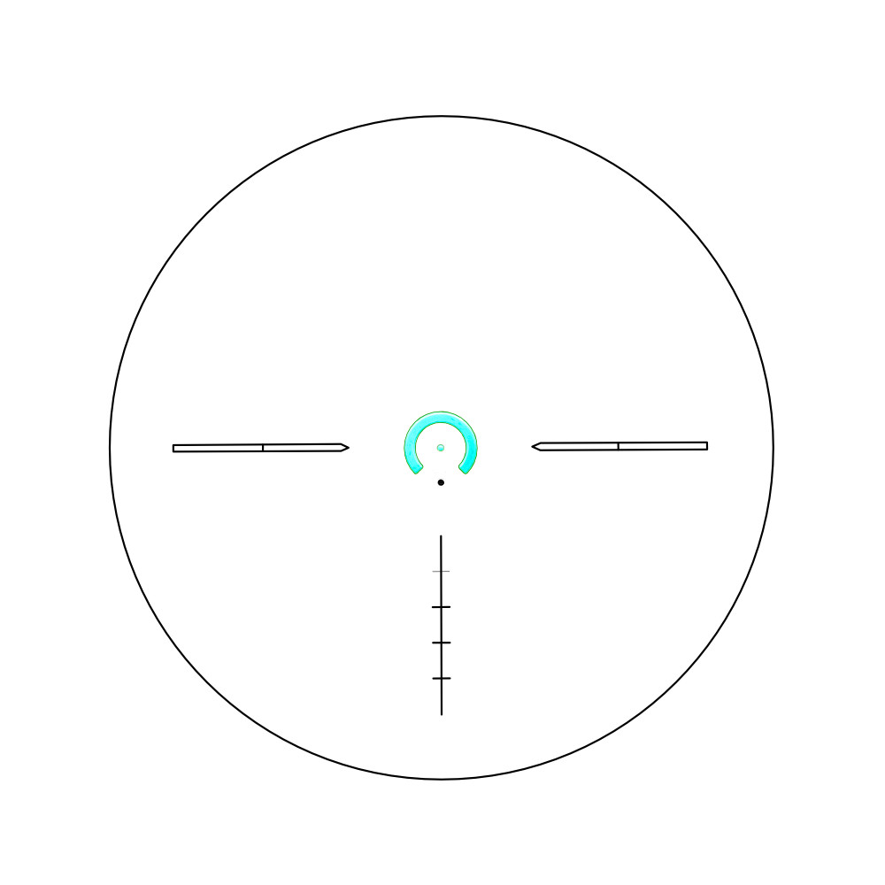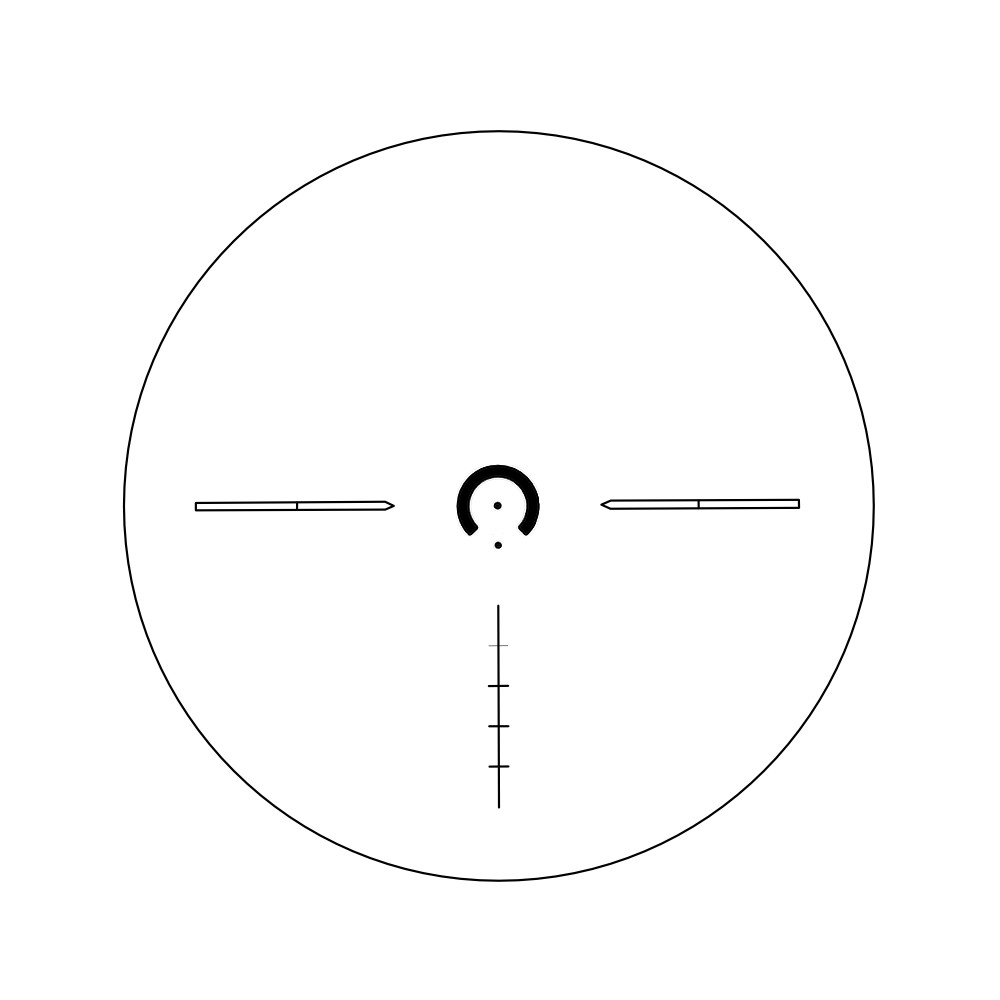 Прицельная сетка вытравлена на стекле и расположена во 2 фокальной плоскости окуляра. При изменении кратности прицела размер сетки в поле зрения не меняется. Размеры прицельной сетки (см.изображения) указаны для максимального увеличения.