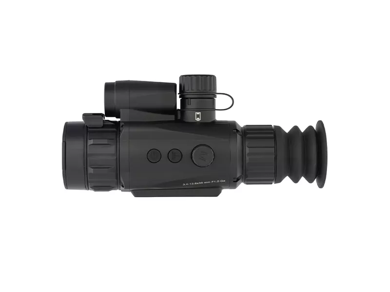 Выходной угол оптической системы, составляющий 7,5х5,6° обеспечивает хорошую обзорность при любой установленной кратности.Номинальное (оптическое) увеличение ИК прицела составляет х3,4, что позволяет комфортно охотиться на минимальных дистанциях с быстрым прицеливанием по внезапно показавшейся добыче. Предельная кратность х13,6 делает инфракрасный прицел удобным инструментом для работы по крупным животным на расстояниях в несколько сотен метров. Регулируемый цифровой зум гарантирует быструю подстройку под любую дальность и особенности охоты.