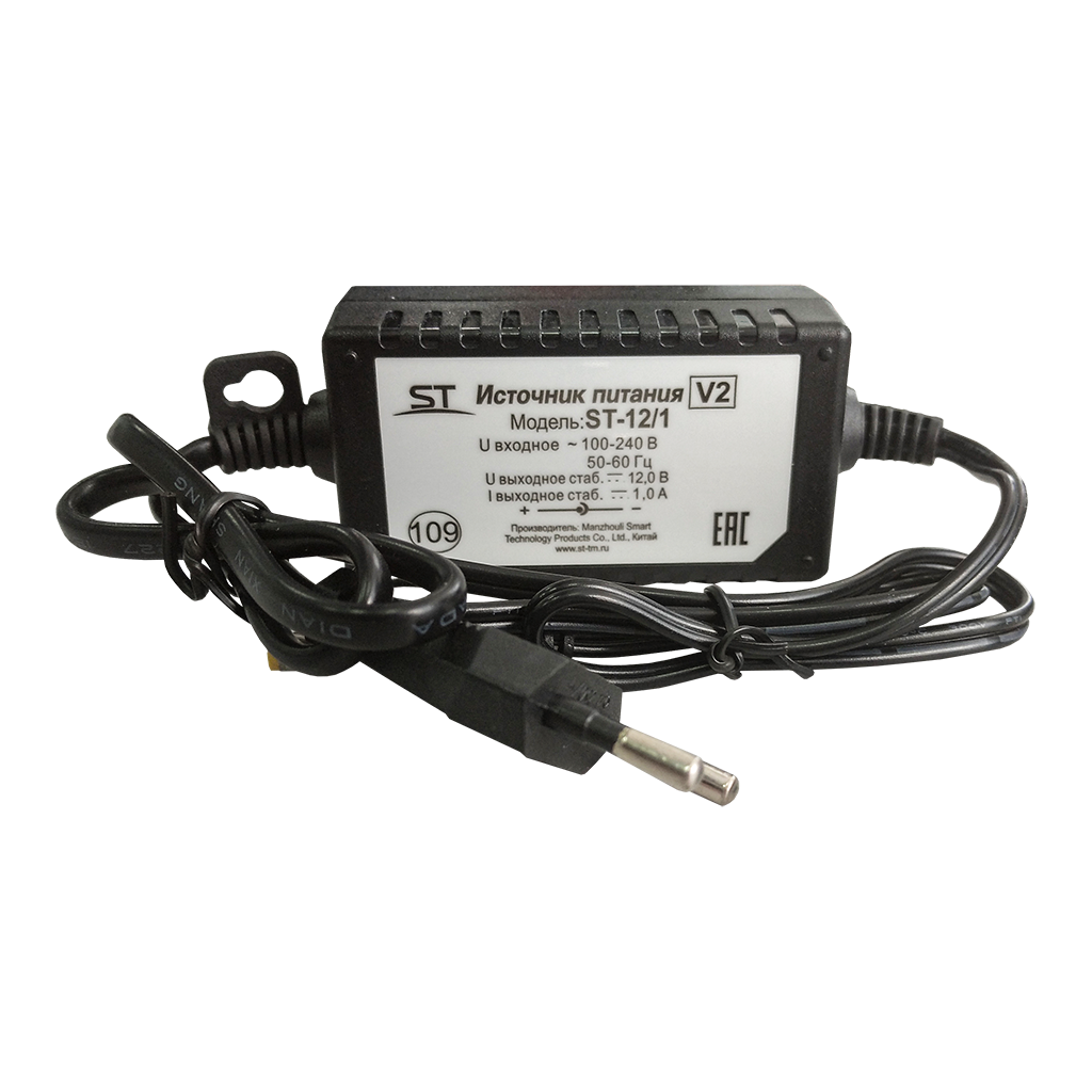 ST-12/1, (версия 2), Стабилизированный источник питания для питания аппаратуры напряжением 12В, Ток нагрузки рабочий/максимальный: 1 А, Входное напряжение: 100-240 В, Потребляемая мощность по сети 220В: 14,8 Вт, Мощность по цепи нагрузки 12 Вольт (при максимальном выходном токе: 12 Вт, Выходное напряжение, номинальное: 12 В, Величина пульсаций выходного напряжения при номинальном токе нагрузки: не более 110 мВ, Ток ограничения выхода при коротком замыкании нагрузки: >1 А, Индикация: есть, Защита выхода от КЗ с восстановлением нормального режима работы после устранения проблемы, Пластик, Температура эксплуатации: 0°...+40°C, Габариты изделия, мм.: 80*44*31 мм