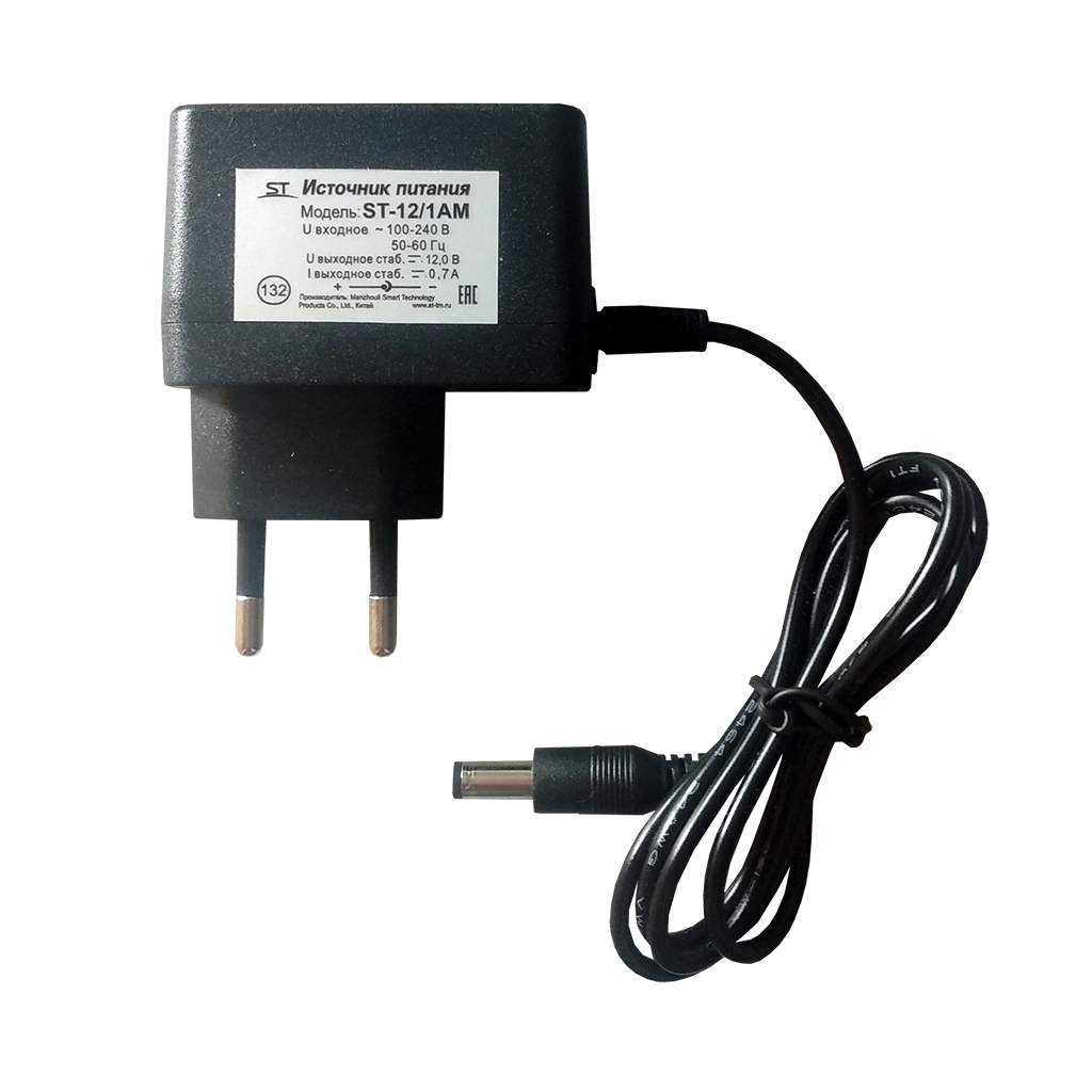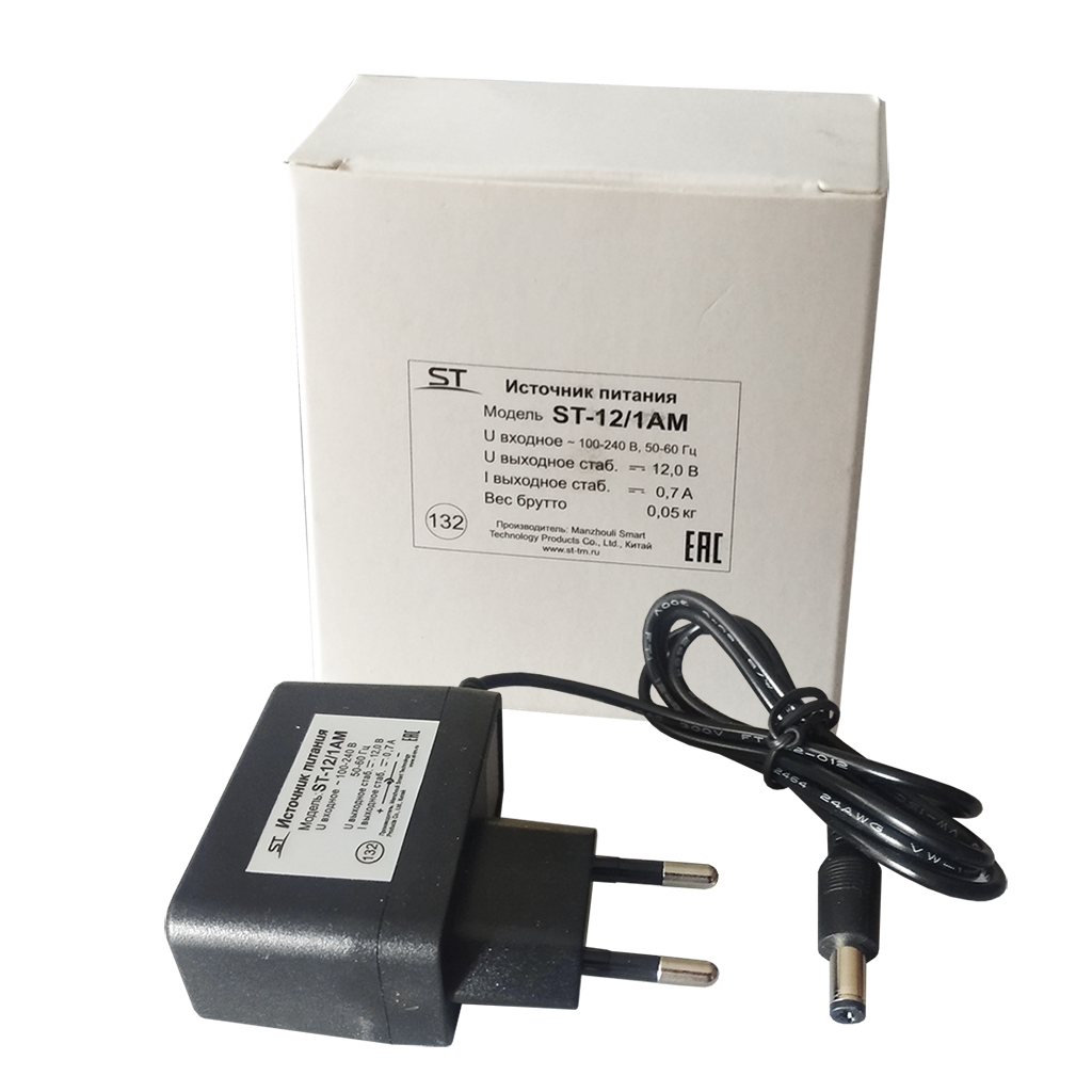 Блок питания ST-12/1AM (0,7А), Стабилизированный источник питания для питания аппаратуры напряжением 12В, Ток нагрузки рабочий/максимальный: (макс.) 0,7 А, Потребляемая мощность по сети 220В: 14,8 Вт, Мощность по цепи нагрузки 12 Вольт (при максимальном выходном токе: 8,4 Вт, Напряжение выходное,номинальное при наличии напряжения сети 220B: 12 В, Величина пульсаций выходного напряжения при номинальном токе нагрузки: не более 110 мВ, Ток ограничения выхода при коротком замыкании нагрузки: >0,75 А, Защита выхода от КЗ с восстановлением нормального режима работы после устранения проблемы, Пластик, Температура эксплуатации: 0°...+40°C, Габариты изделия, мм.: 74*56*25 мм