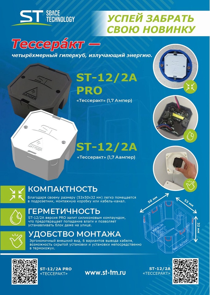 ST-12/2А PRO «Тессеракт» (1,7А/OUT), Стабилизированный источник питания для питания радиоэлектронных устройств не бытового применения напряжением 12 В, Ток нагрузки рабочий/максимальный: (макс.) 1,7 А, Потребляемая мощность по сети 220В: 31,0 Вт, Мощность по цепи нагрузки 12 Вольт (при максимальном выходном токе: 20,4 Вт, Напряжение выходное,номинальное при наличии напряжения сети 220B: 12,0 В, Величина пульсаций выходного напряжения при номинальном токе нагрузки: 90 мВ, Ток ограничения выхода при коротком замыкании нагрузки: >1,75 А, При перегрузке по току (КЗ выхода) источник отключает питание нагрузки. После устранения причин перегрузки по току (КЗ), работоспособность восстанавливается автоматически, Пластик, Температура эксплуатации: -45°… +50°С, Степень защиты: Ip67, Габариты изделия, мм.: 53*50*32 мм