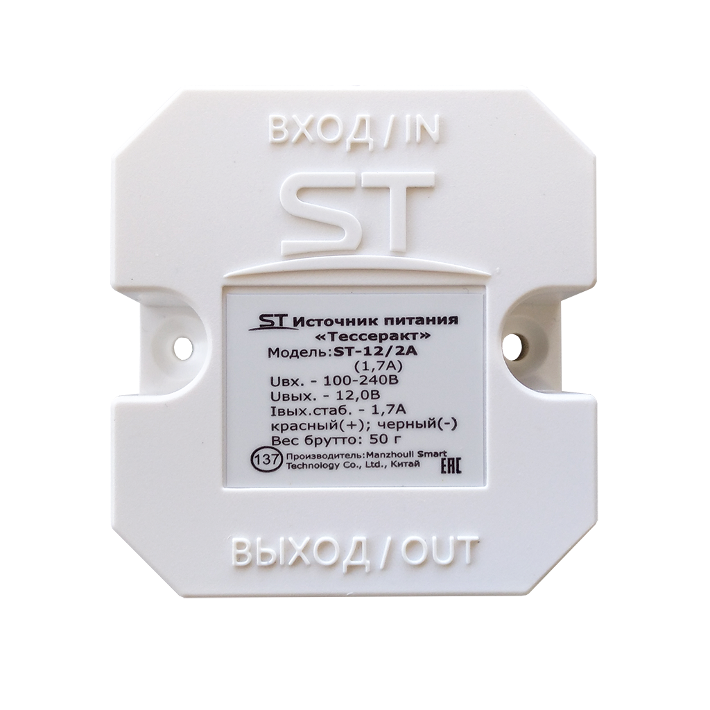 ST-12/2А «Тессеракт» (1,7А), Стабилизированный источник питания для питания радиоэлектронных устройств не бытового применения напряжением 12 В, Ток нагрузки рабочий/максимальный: (макс.) 1,7 А, Потребляемая мощность по сети 220В: 31,0 Вт, Мощность по цепи нагрузки 12 Вольт (при максимальном выходном токе: 20,4 Вт, Напряжение выходное,номинальное при наличии напряжения сети 220B: 12,0 В, Величина пульсаций выходного напряжения при номинальном токе нагрузки: 90 мВ, Ток ограничения выхода при коротком замыкании нагрузки: >1,75 А, При перегрузке по току (КЗ выхода) источник отключает питание нагрузки. После устранения причин перегрузки по току (КЗ), работоспособность восстанавливается автоматически, Пластик, Температура эксплуатации: -10°… +40°С, Степень защиты: Ip54, Габариты изделия, мм.: 53*50*32 мм