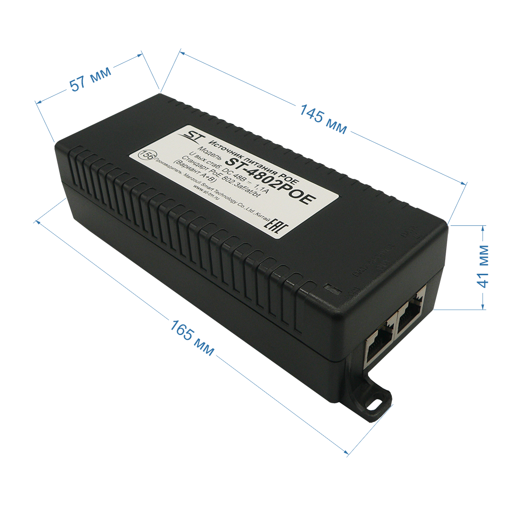 ST-4802POE, Источник питания POE однопортовый для обеспечения проводных сетей напряжением 48В., Ток нагрузки рабочий/максимальный: 1,1А, Входное напряжение: 110-240 Вольт перем. тока, Выходное напряжение, номинальное: 48 Вольт 60 Ватт всего 1-н канал(порт), Защита от КЗ,защита по току/напряжению от перегрузки - 115% -150% от номинала, Тип разъема: данные/данные+питание RJ45, Max.пропускная способность: 10/100/1000 Mb, Относит. влажность воздуха эксплуатации: 10-90%, Макс. мощность PoE на один порт: 15,4Вт (IEEE 802.3af),30Вт (IEEE 802.3at), 60Вт (IEEE 802.3bt), Вариант работы: А+В, Пластик, Температура эксплуатации: от -10°C до +55°C, Габариты изделия, мм.: 167*57*40 мм