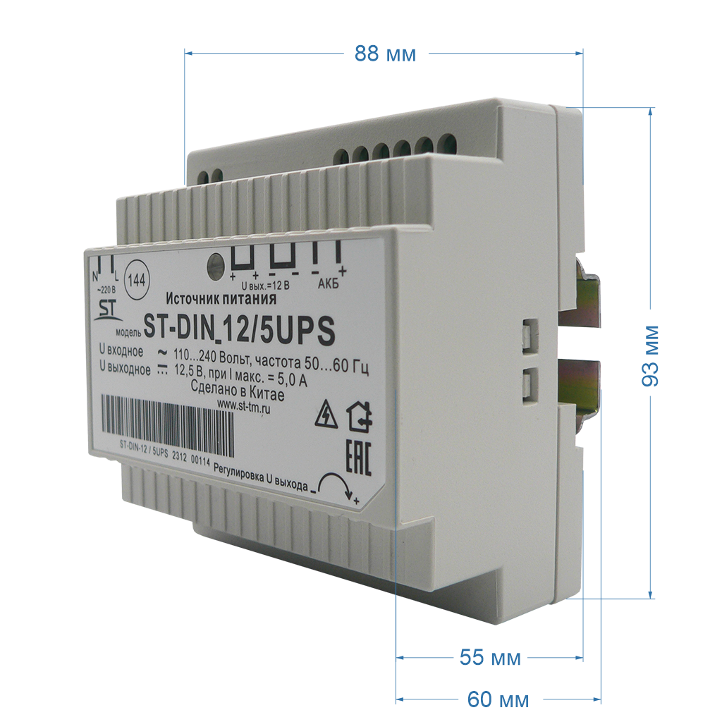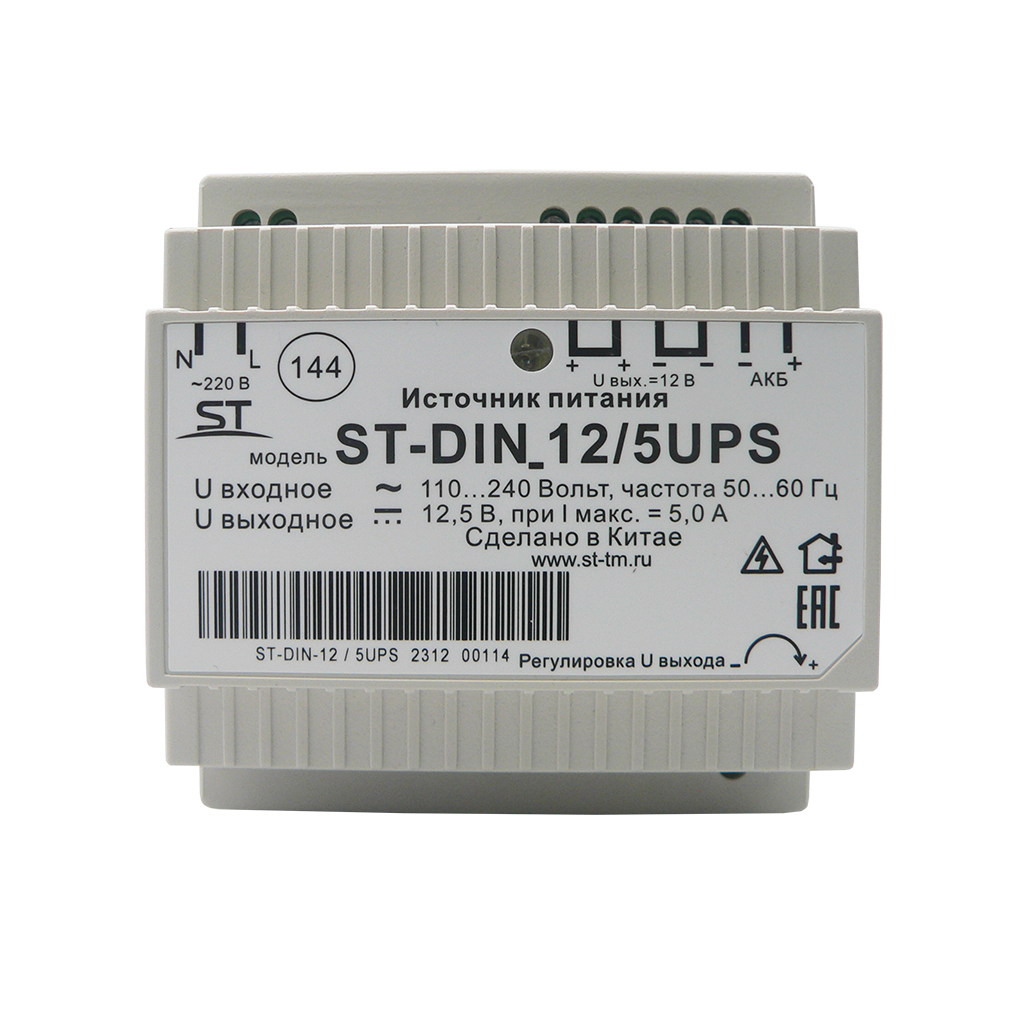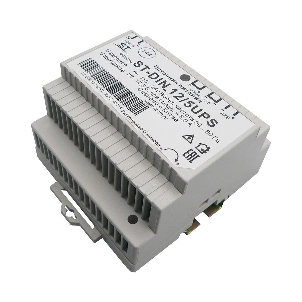 ST-DIN 12/5UPS, Стабилизированный источник питания на DIN-рейке с функцией подключения АКБ для питания аппаратуры напряжением 12В, Ток нагрузки рабочий/максимальный: 5,0А, Мощность по цепи нагрузки 12 Вольт (при максимальном выходном токе: 60Вт, Выходное напряжение, номинальное: 12,5В, Максимальный ток заряда АКБ: 0,7А, Ток ограничения выхода при коротком замыкании нагрузки: >6,0А, Защита выхода от КЗ с восстановлением нормального режима работы после устранения проблемы,защита АКБ от глубокого разряда,регулировка выходного напряжения, Емкость АКБ: рекомендуемая емкость подключаемого АКБ (напряжением 12 Вольт с электрической емкостью 7 или 12 А/ч), Пластик, Температура эксплуатации: -10...+45°C