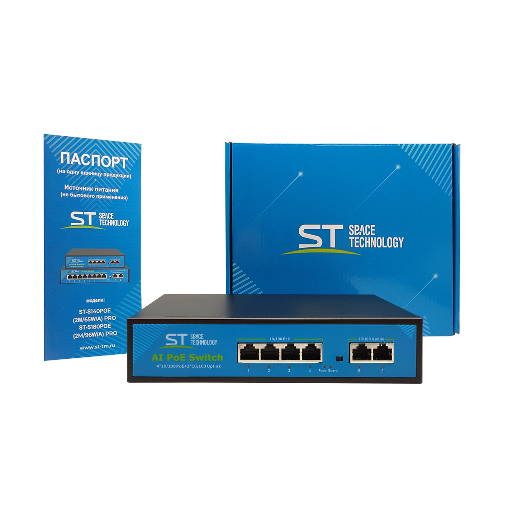 Источник питания ST-S140POE (2М/100W/А) PRO резервируемый , Switch POE 4-х портовый для обеспечения проводных сетей напряжением 48В, защита от КЗ, Extend 250м., AI PoE, AI QoS, AI VLAN, Грозозащита, PoE порты: 4 х (10/100 Мбит/с), UpLink порты: 2 х (10/100 Мбит/с), SFP порты: нет, Max.пропускная сп-ть: 100 Мбит/канал, Uвых: 48 (PoE 802.3 af/at), Р(ном) каждый порт (Вт): 12 Вт (12 В) 24 Вт (24 В), Р(макс) каждый порт (Вт): 30 Вт, Р(сумм) общая (Вт): 50 Вт (12 В) 100 Вт (24 В), Тип РоЕ: А, Коммутационная способность (Гбит/с): 1,0 Гбит/с, AI PoE(watchdog)/Vlan/Extend/QoS, Система охлаждения: пассивная, Металл, Температура эксплуатации: От -45°C до +55°C, Габариты изделия, мм.: 200х140х44 мм