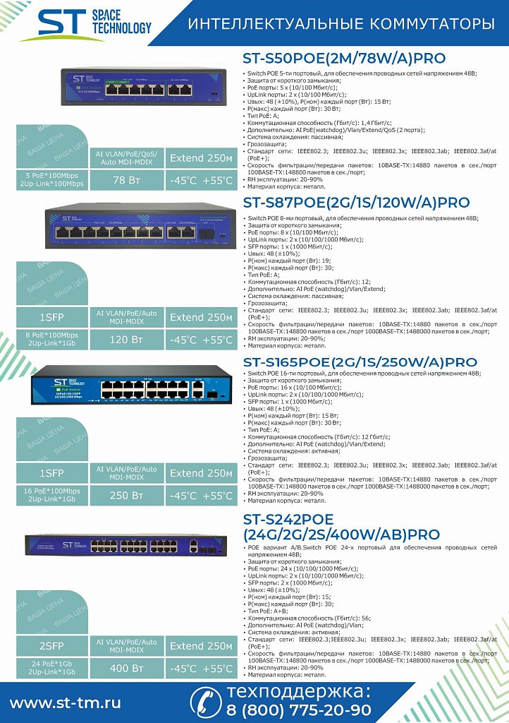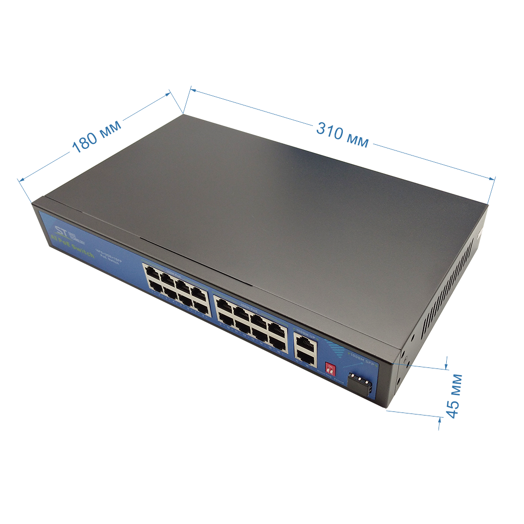 Источник питания ST-S165POE (2G/1S/250W/A)PRO, (версия 2), Switch POE 16-ти портовый,для обеспечения проводных сетей напряжением 48В, защита от КЗ, Extend 250м., AI PoE, AI VLAN, Грозозащита, PoE порты: 16 х (10/100 Мбит/с), UpLink порты: 2 х (10/100/1000 Мбит/с), SFP порты: 1 х (10/100/1000 Мбит/с), Max.пропускная сп-ть: 100 Мбит/канал (PoE порты), 1000Мбит/канал (UpLink и SFP порты), Uвых: 48 (±10%), Р(ном) каждый порт (Вт): 15,6 Вт, Р(макс) каждый порт (Вт): 30 Вт, Р(сумм) общая (Вт): 250 Вт, Тип РоЕ: А, Коммутационная способность (Гбит/с): 9,2 Гбит/с, AI PoE(watchdog), VLAN, Extend, Система охлаждения: пассивная, Активное РОЕ Металл, Температура эксплуатации: От -45°C до +55°C, Габариты изделия, мм.: 310х180х45