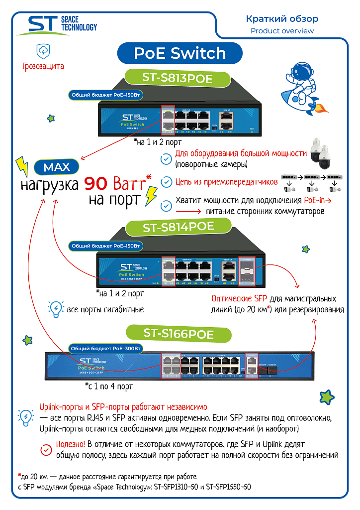 ST-S166POE (16G/2G/2S/300W/АB/4BT) PRO, Switch POE 16-и портовый для обеспечения проводных сетей напряжением 48В , Защита от КЗ, Extend 250м., AI PoE, AI VLAN, Грозозащита, PoE порты: 16 х (10/100/1000 Мбит/с), UpLink порты: 2 х (10/100/1000 Мбит/с), SFP порты: 2 х (10/100/1000 Мбит/с), Max.пропускная сп-ть: 1000 Мбит/канал, Uвых: 48 (±10%), Р(ном) каждый порт (Вт): 1-4 порты 60Вт, 5-16 порты 19Вт, Р(макс) каждый порт (Вт): 1-4 порты 90Вт, 5-16 порты 30Вт, Р(сумм) общая (Вт): 300 Вт, Тип РоЕ: А+B, Коммутационная способность (Гбит/с): 40 Гбит/с, AI PoE(watchdog)/Vlan/Extend, Система охлаждения: Пассивная, Активное РОЕ Металл, Температура эксплуатации: От -45°C до +55°C, Габариты изделия, мм.: 442х190x45