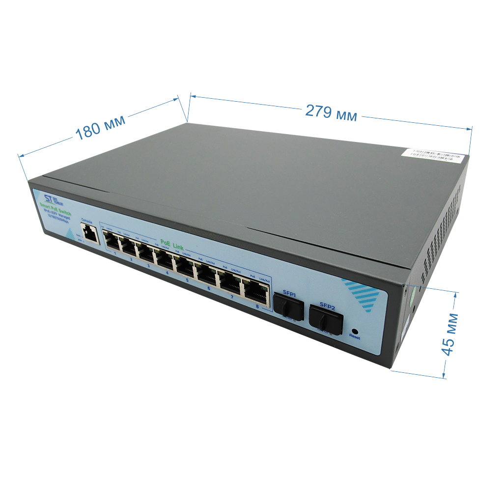Источник питания ST-S308POE(8G/2S/1C/120W/A) PRO M, преобразователи статические предназначены для обеспечения проводных сетей напряжением 48 Вольт, Стандарты PoE: IEEE 802.3af/at, AI QoS, AI VLAN, Грозозащита, PoE порты: 8 х (10/100/1000 Мбит/с), SFP порты: 2 х (10/100/1000 Мбит/с), Max.пропускная сп-ть: 1000 Мбит/канал, Uвых: 48 (±10%), Р(ном) каждый порт (Вт): 15 Вт, Р(макс) каждый порт (Вт): 30 Вт, Р(сумм) общая (Вт): 120 Вт, Тип РоЕ: A, Коммутационная способность (Гбит/с): 20gb, Port Management, Port Mirroring, Port Speed Limiting, Port Isolation, location unicast, unknown multicast, broadcast storm control, VLAN, 802.1d (RSTP), IGMP-snooping, LLDP, CLI (serial port command), Telnet, SNMP V1/V2, Web, RMONV1, Система охлаждения: пассивная, Активное POE Управляемые коммутаторы: Да, Металл, Температура эксплуатации: От -10°C до +55°C, Габариты изделия, мм.: 270х180х44