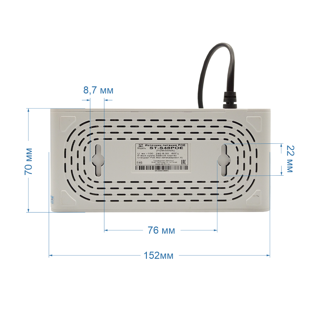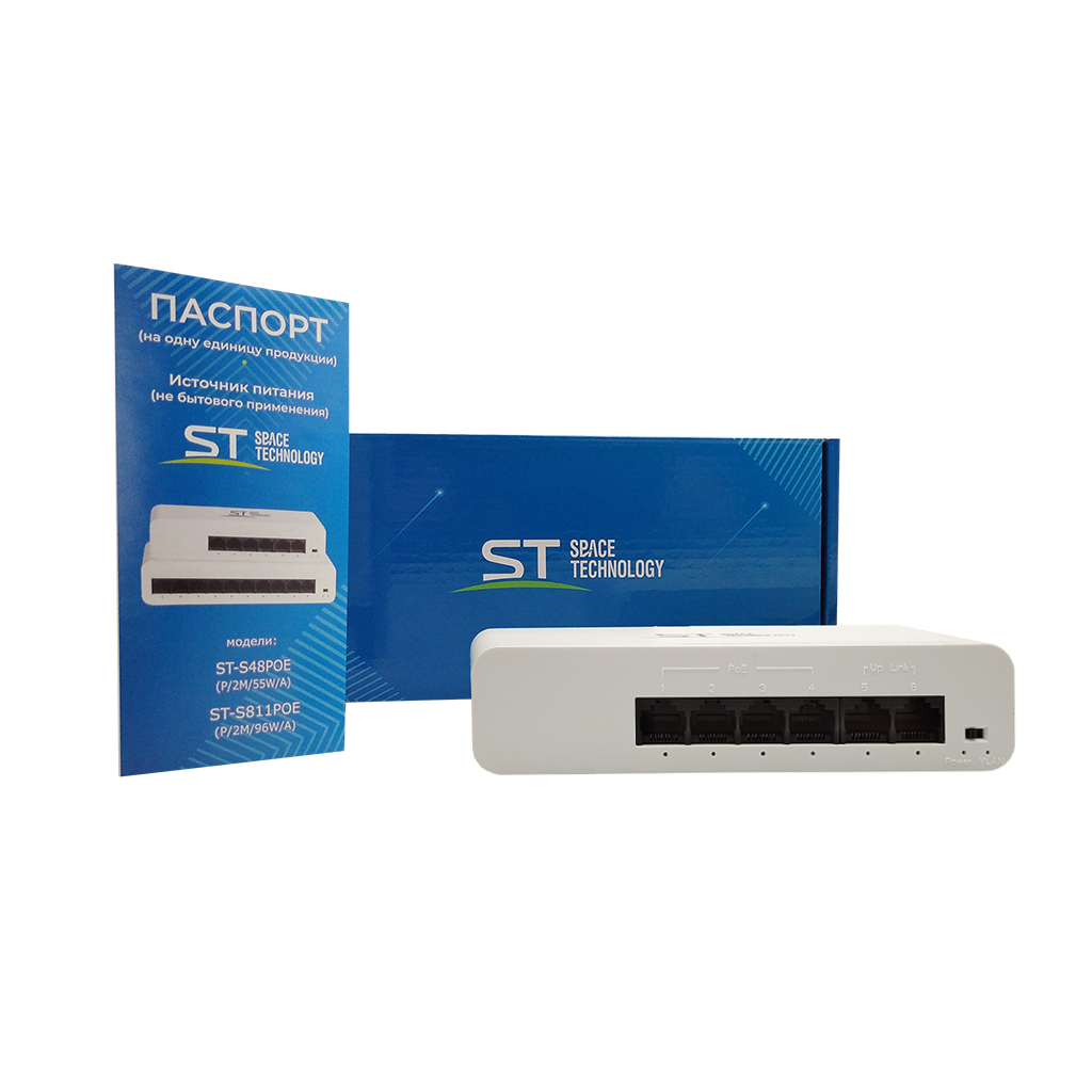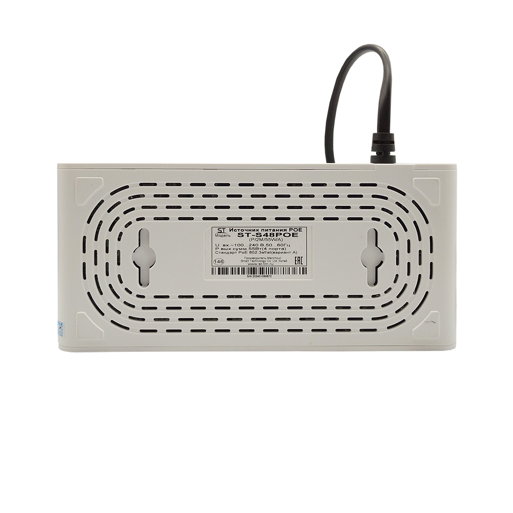 Источник питанияST-S48POE (P/2М/55W/А), Switch POE 4-х портовый,для обеспечения проводных сетей напряжением 48В, защита от КЗ, Extend 250м., VLAN, PoE порты: 4 х (10/100 Мбит/с), UpLink порты: 2 х (10/100 Мбит/с), Max.пропускная сп-ть: 100 Мбит/канал, Uвых: 48 (±10%), Р(ном) каждый порт (Вт): 13,75 Вт, Р(макс) каждый порт (Вт): 30 Вт, Р(сумм) общая (Вт): 55 Вт, Тип РоЕ: А, Коммутационная способность (Гбит/с): 1 Гбит/с, Extend - режим работы с увеличением дальности передачи до 250м VLANизоляция РоЕ портов, Система охлаждения: пассивная, Пластик, Температура эксплуатации: От -10°C до +55°C, Габариты изделия, мм.: 152x69,2x36 мм