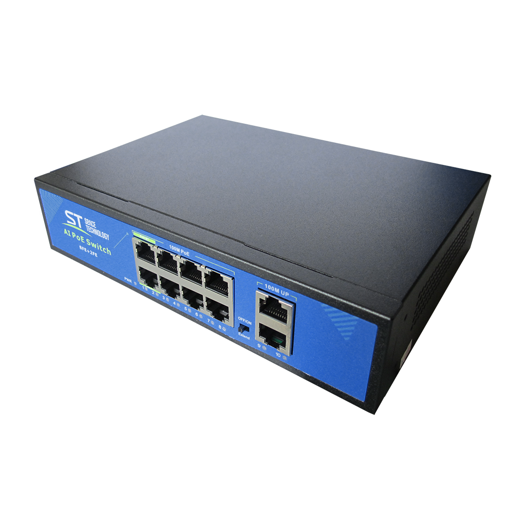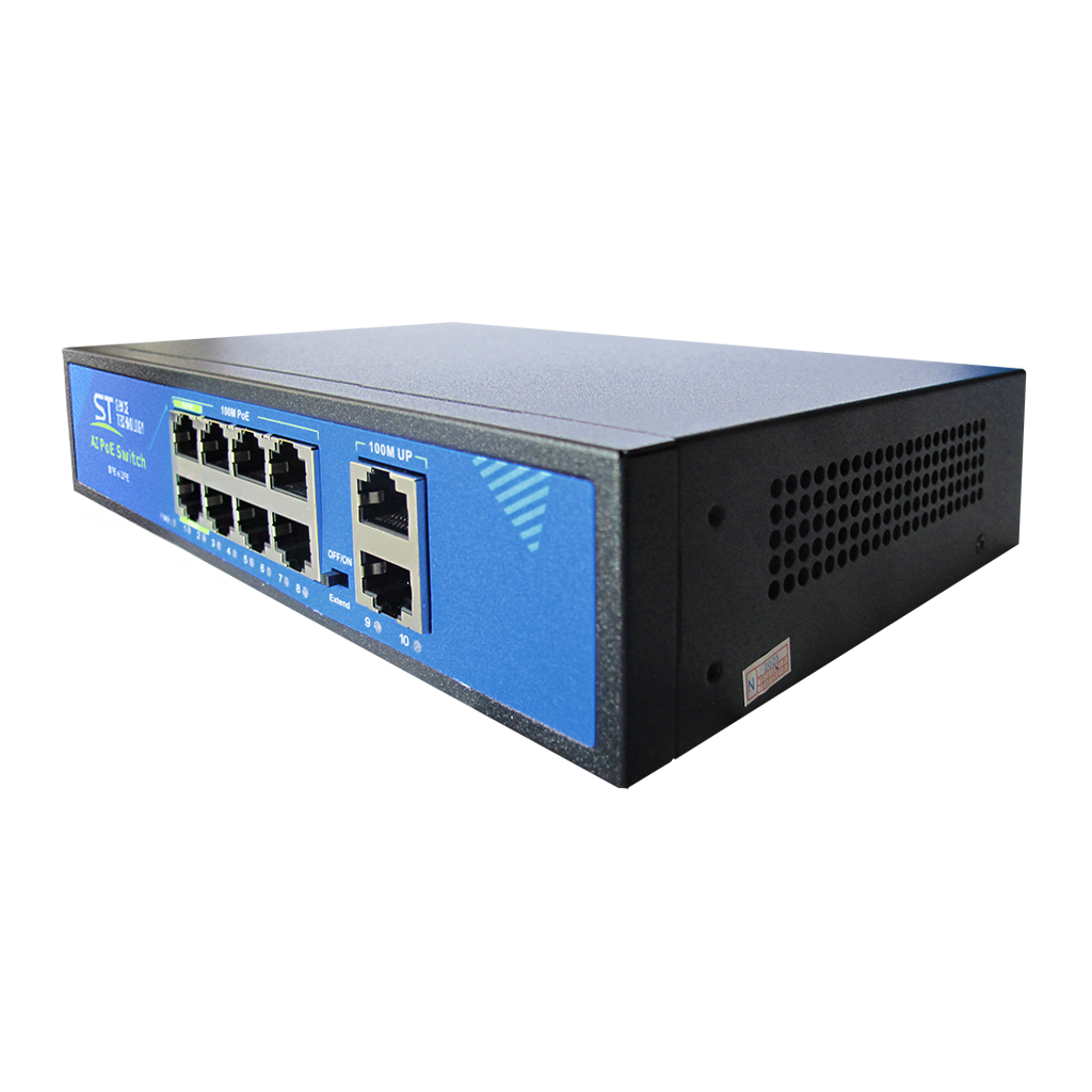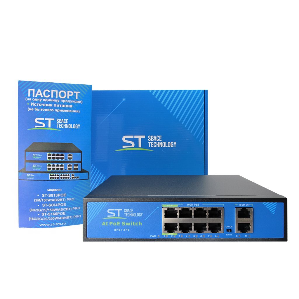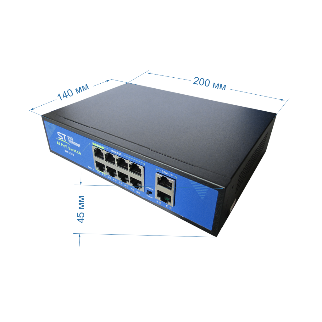 ST-S813POE (2M/150W/АB/2BT) PRO, Switch POE 8-ми портовый для обеспечения проводных сетей напряжением 48В , Защита от КЗ, Extend 250м., AI PoE, AI VLAN, Грозозащита, PoE порты: 8 х (10/100 Мбит/с), UpLink порты: 2 х (10/100 Мбит/с), SFP порты: Нет, Max.пропускная сп-ть: 100 Мбит/канал, Uвых: 48 (±10%), Р(ном) каждый порт (Вт): 1-2 порты 60Вт, 3-8 порты 19Вт, Р(макс) каждый порт (Вт): 1-2 порты 90Вт, 3-8 порты 30Вт, Р(сумм) общая (Вт): 150 Вт, Тип РоЕ: А+B, Коммутационная способность (Гбит/с): 2 Гбит/с, AI PoE(watchdog)/Vlan/Extend, Система охлаждения: Пассивная, Активное РОЕ Металл, Температура эксплуатации: От -45°C до +55°C, Габариты изделия, мм.: 220х140x45