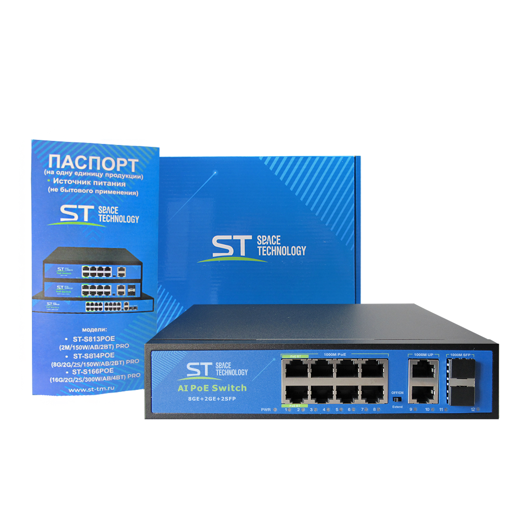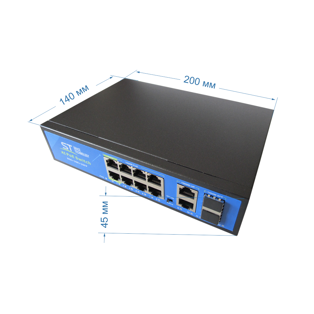 ST-S814POE (8G/2G/2S/150W/АB/2BT) PRO, Switch POE 8-ми портовый для обеспечения проводных сетей напряжением 48В , Защита от КЗ, Extend 250м., AI PoE, AI VLAN, Грозозащита, PoE порты: 8 х (10/100/1000 Мбит/с), UpLink порты: 2 х (10/100/1000 Мбит/с), SFP порты: 2 х (10/100/1000 Мбит/с), Max.пропускная сп-ть: 1000 Мбит/канал, Uвых: 48 (±10%), Р(ном) каждый порт (Вт): 1-2 порты 60Вт, 3-8 порты 19Вт, Р(макс) каждый порт (Вт): 1-2 порты 90Вт, 3-8 порты 30Вт, Р(сумм) общая (Вт): 150 Вт, Тип РоЕ: А+B, Коммутационная способность (Гбит/с): 24 Гбит/с, AI PoE(watchdog)/Vlan/Extend, Система охлаждения: Пассивная, Активное РОЕ Металл, Температура эксплуатации: От -45°C до +55°C, Габариты изделия, мм.: 220х140x45