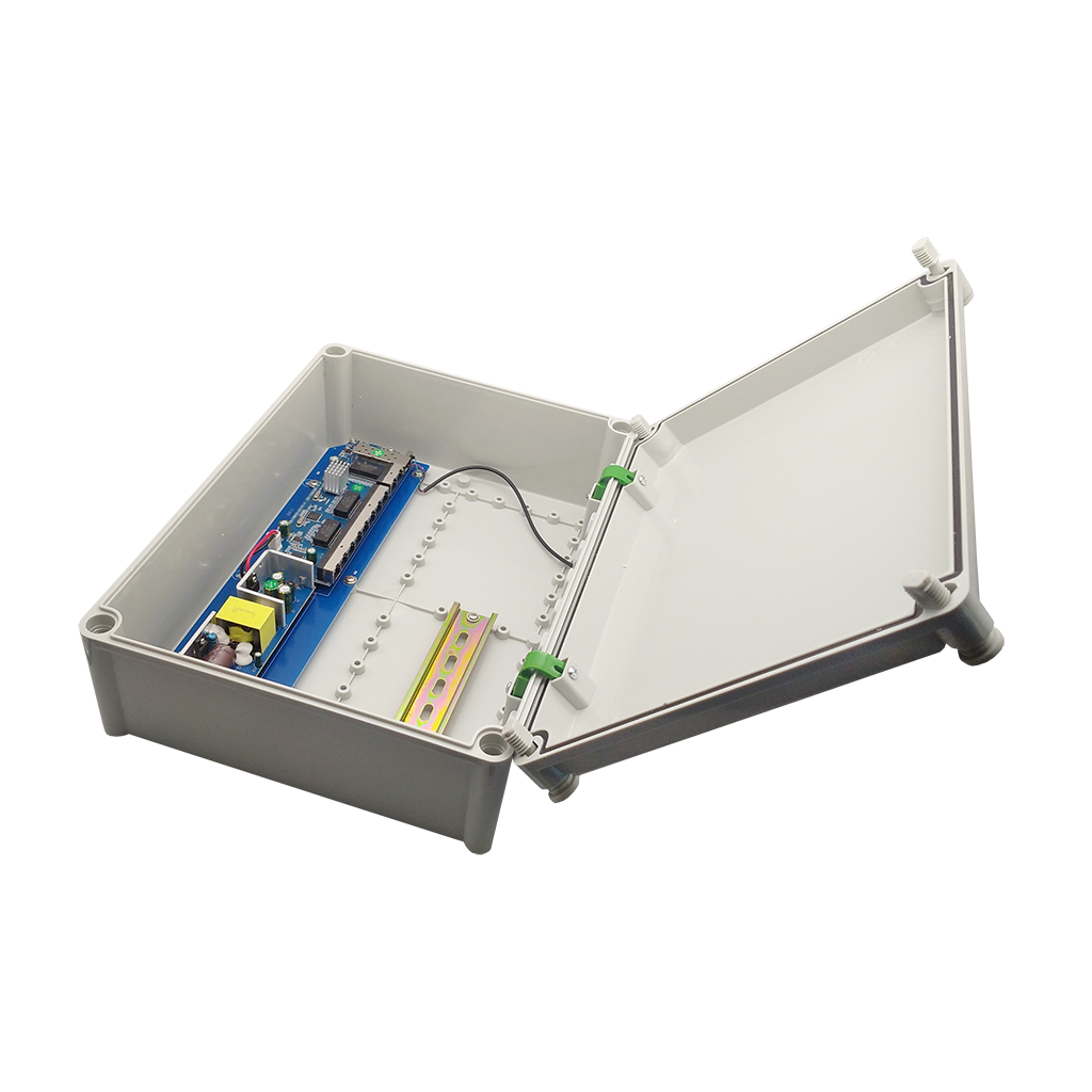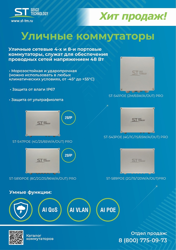 Источник питания ST-S89POE (2G/1S/120W/А/OUT)PRO, Switch POE 8-ми портовый,уличный для обеспечения проводных сетей напряжением 48В, защита от КЗ, Extend 250м., AI PoE, AI VLAN, Грозозащита, PoE порты: 8 х (10/100 Мбит/с), UpLink порты: 2 х (10/100/1000 Мбит/с), SFP порты: 1 х (10/100/1000 Мбит/с), Max.пропускная сп-ть: 100 Мбит/канал (PoE порты)1000 Мбит/канал (UpLink и SFP порты), Uвых: 48 (±10%), Р(ном) каждый порт (Вт): 19Вт, Р(макс) каждый порт (Вт): 30Вт, Р(сумм) общая (Вт): 120Вт, Тип РоЕ: А, Коммутационная способность (Гбит/с): 12,0Гбит/с, AI PoE(watchdog)/Vlan/Extend, Система охлаждения: пассивная, Пластик, Температура эксплуатации: От -45° до +55°C, Степень защиты: IP67, Габариты изделия, мм.: 230*380*130 мм