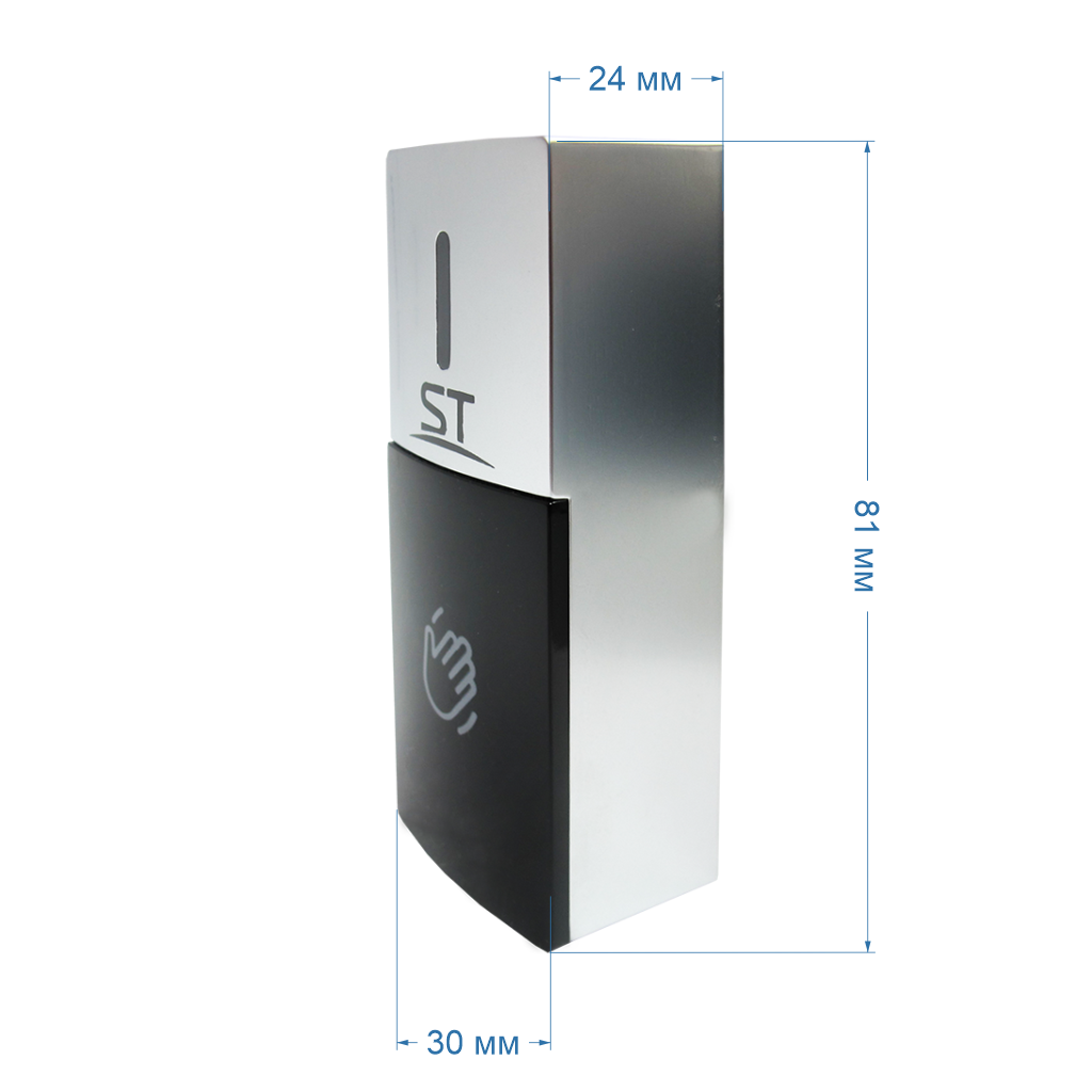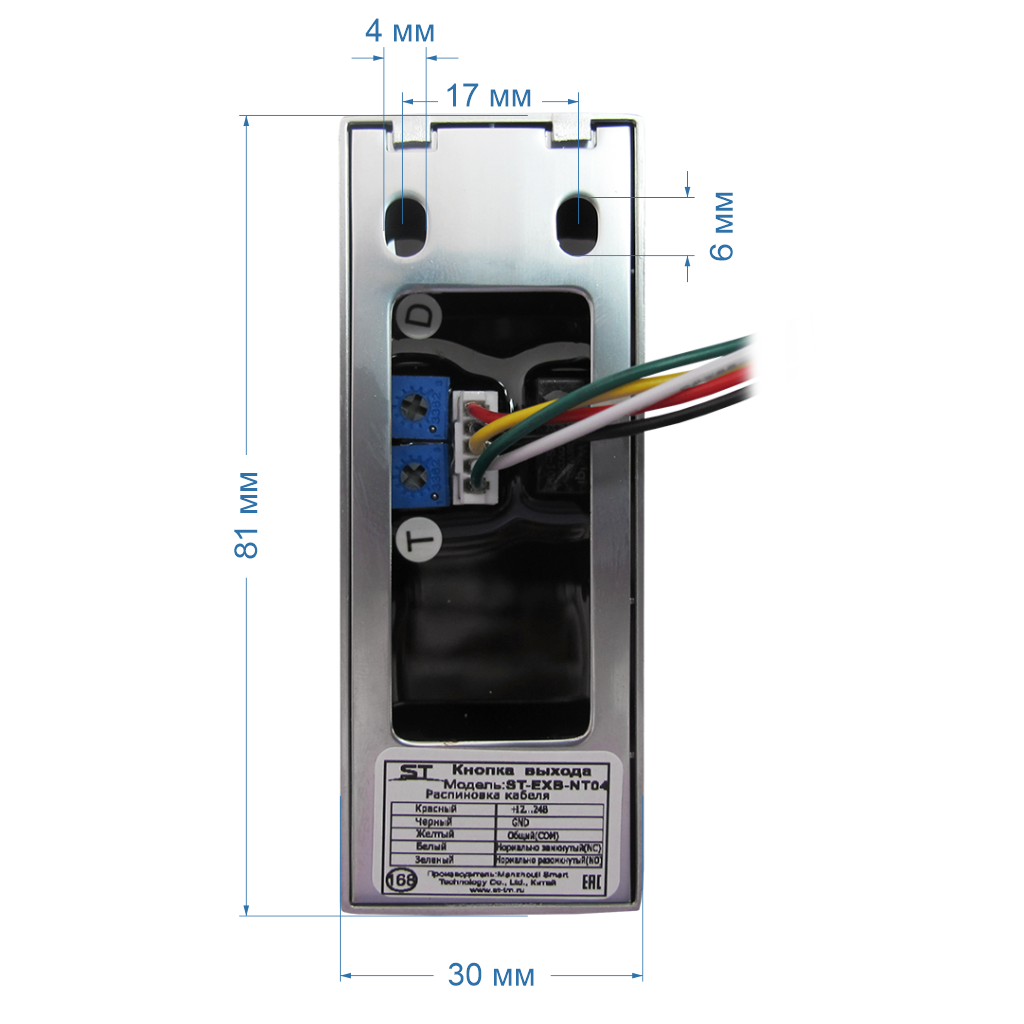 Кнопка выхода ST-EXB-NT04 бесконтактная, Предназначена для работы в составе СКУД или других слаботочных систем.Применяется для управления электромагнитными или электромеханическими замками в составе систем домофонии, Дистанция реагирования: 5-20 см, Напряжение питания(ном.): 12-24В, Потребляемый ток максимальный: не более 30мА, Коммутация ток/напряжение (макс.): 1А/24В, Типы контактов: NO/NC/COM, 5-20 см, 0,3-30 с, Тип монтажа: Накладной, Бесконтактная, –35..+55°C, IP68, Цинковый сплав, Серебряный, черный, 81*31*24 мм