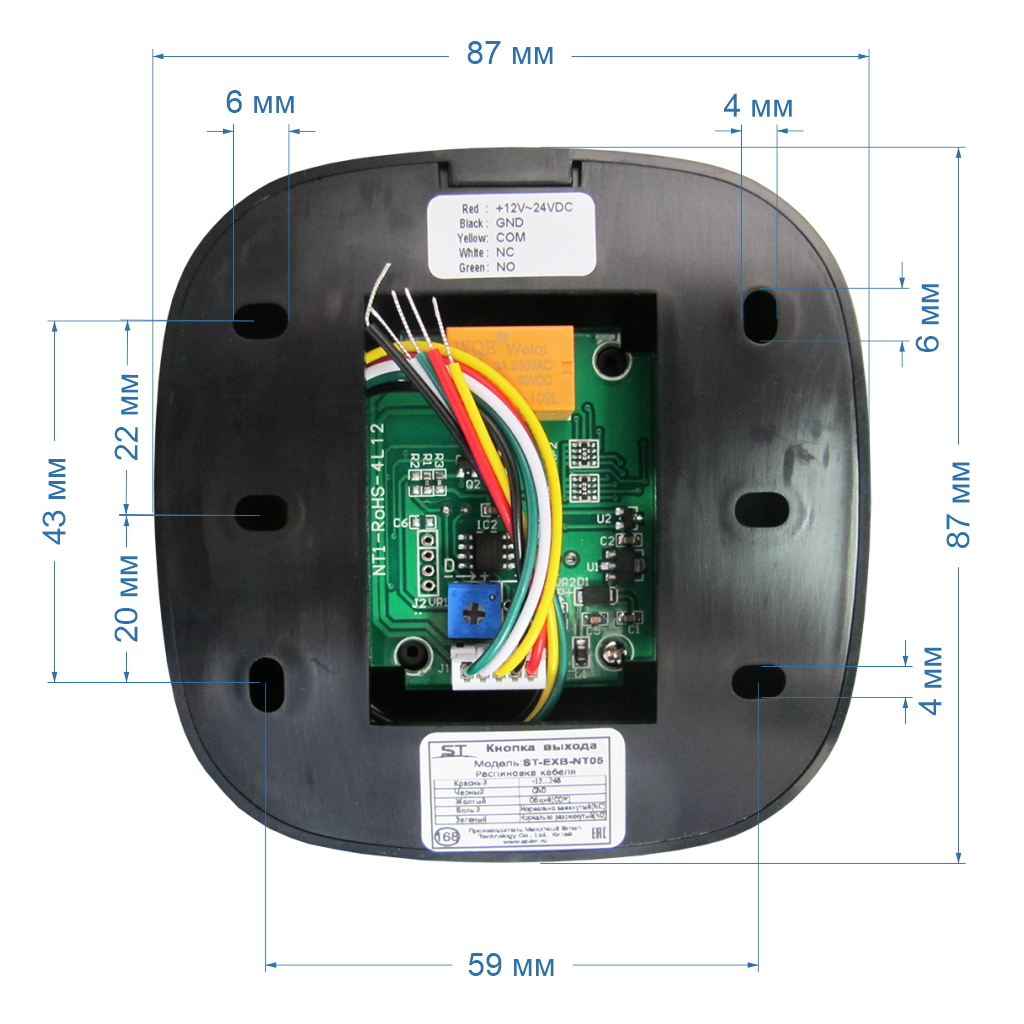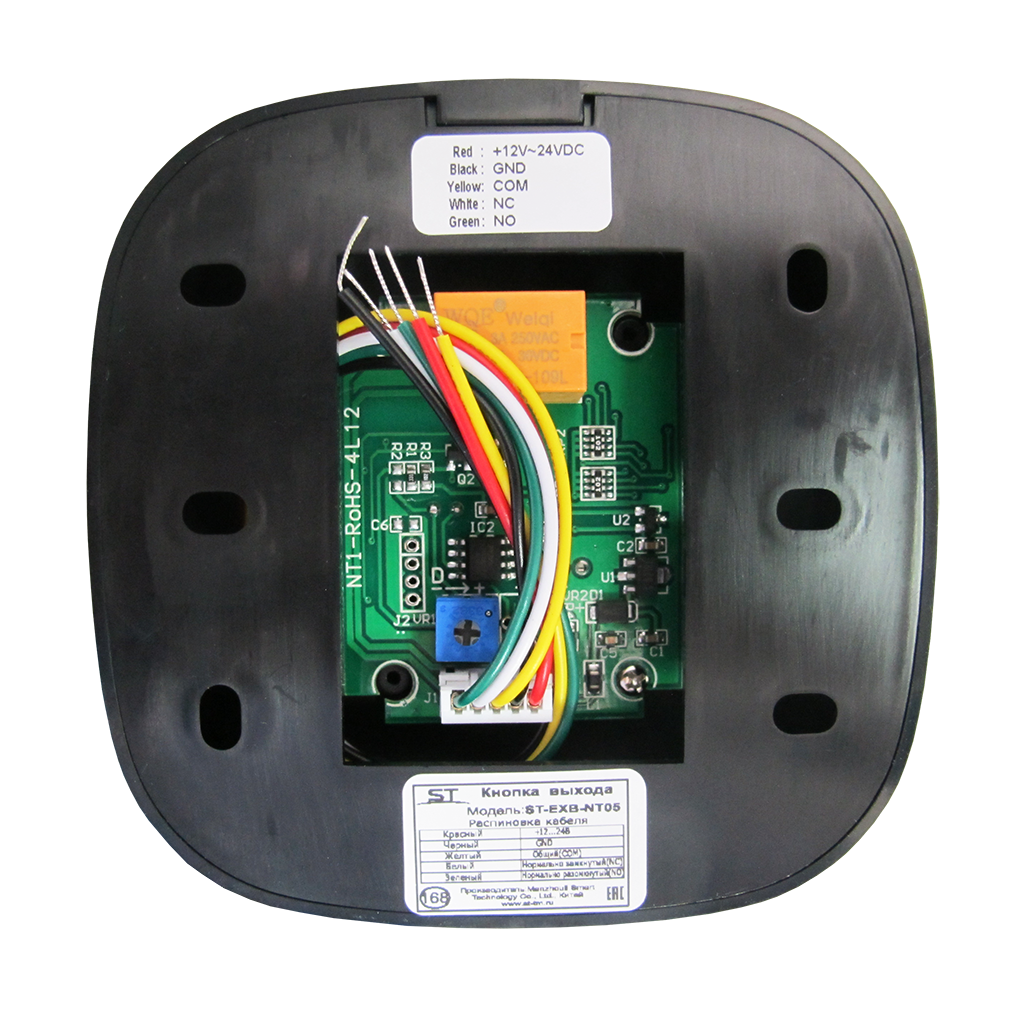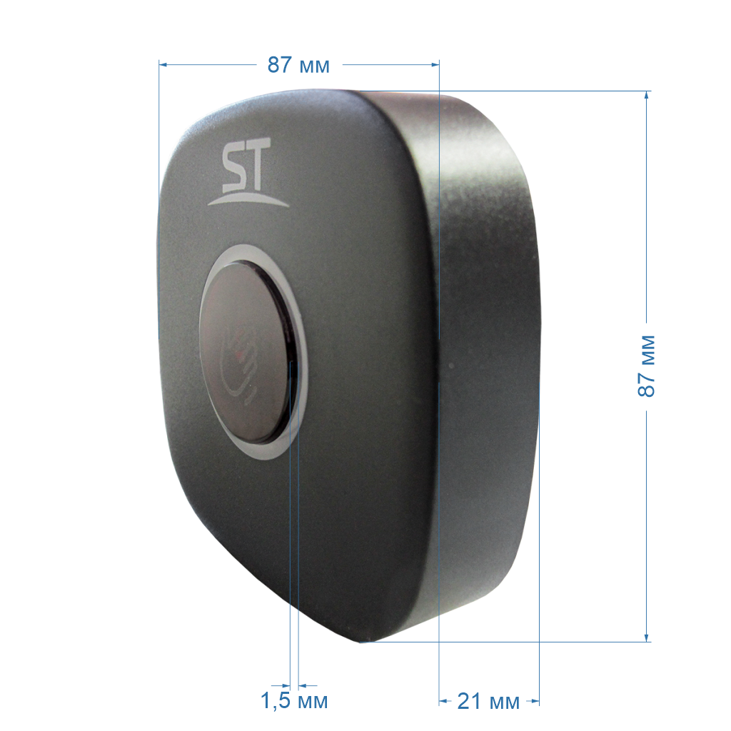 Кнопка выхода ST-EXB-NT05 бесконтактная, Предназначена для работы в составе СКУД или других слаботочных систем.Применяется для управления электромагнитными или электромеханическими замками в составе систем домофонии, Дистанция реагирования: 5-20 см, Напряжение питания(ном.): 12-24В, Потребляемый ток максимальный: не более 60мА, Коммутация ток/напряжение (макс.): 3А/30В, Типы контактов: NO/NC/COM, 5-20 см, 0,3 с, Тип монтажа: Накладной, Бесконтактная, –35..+55°C, IP44, ABS пластик, Черный, 86*86*21 мм