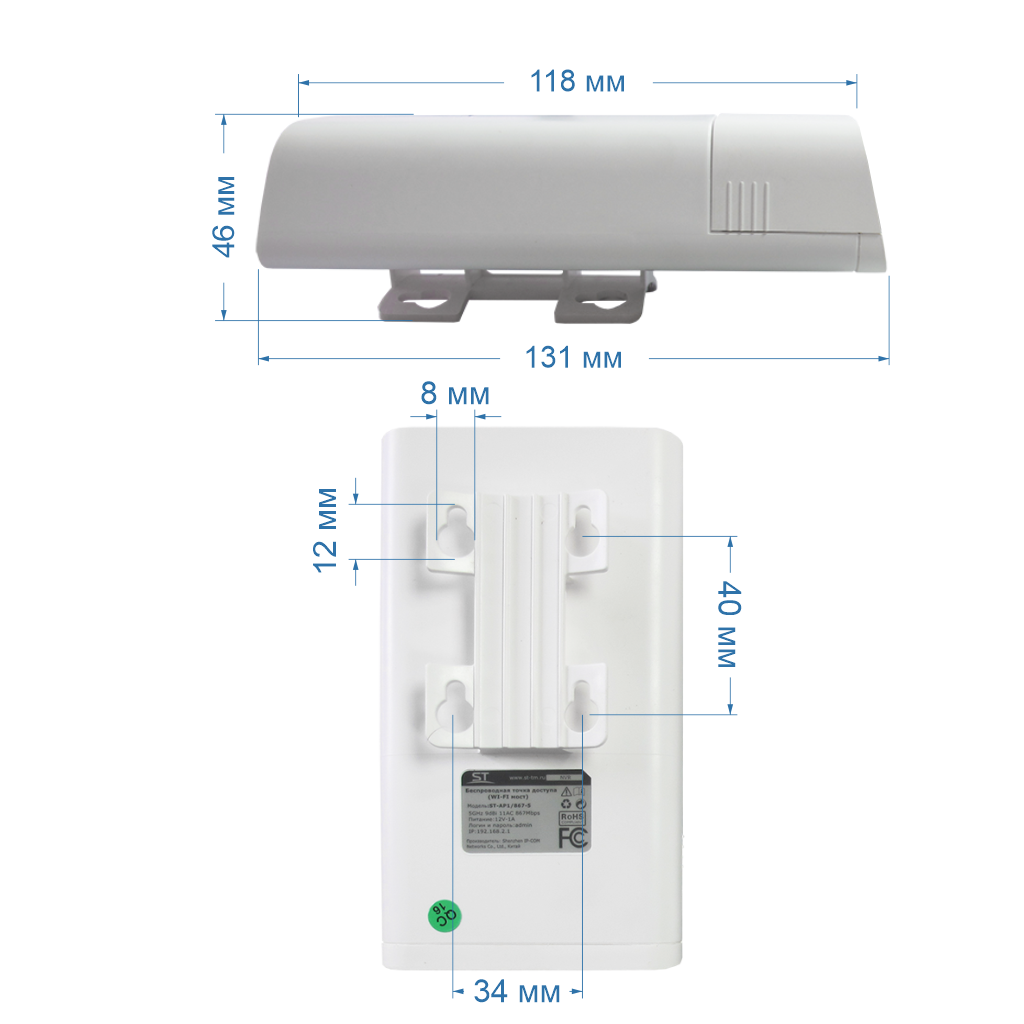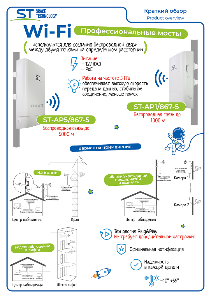 Беспроводная точка доступа ST-AP1/867-5 (комплект 2шт) WI-FI мост предназначен для организации беспроводного интернет трафика на различных расстояниях, Дальность передачи данных: до 1000 м, Интерфейсы: 1*10/100Mbps LAN Port, Антенна: 9dBi, Поляризация: Горизонтальная 30°, Вертикальная 30°, Стандарты Wi-Fi: IEEE 802.11a/n/ac, Частота: 5 ГГц, Скорость передачи данных: до 867Mbps*, Чувствительность приемника: 11a 6Mbps -92dBm±1.5dBm/11n MCS7 HT20 -72dBm±1.5dBm/11ac MCS9 HT80 -64dBm±1.5dBm, Мощность передатчика (не более): 100мВт, Режимы работы: Точка доступа/Станция, Безопасность: 64/128 WEP,WPA-PSK,WPA2-PSK,WPA&WPA2-PSK, Питание: 12В 1А/Passive PoE LAN (+4,5 -7,8) 12В 1А (до 60м), Степень защищенности: IP65, Стандарт сети: WiFi IEEE 802.11a/n/ac, рабочая: -30º С ~ 60º С хранения: -40º С ~ 70º С, 132х72х46
