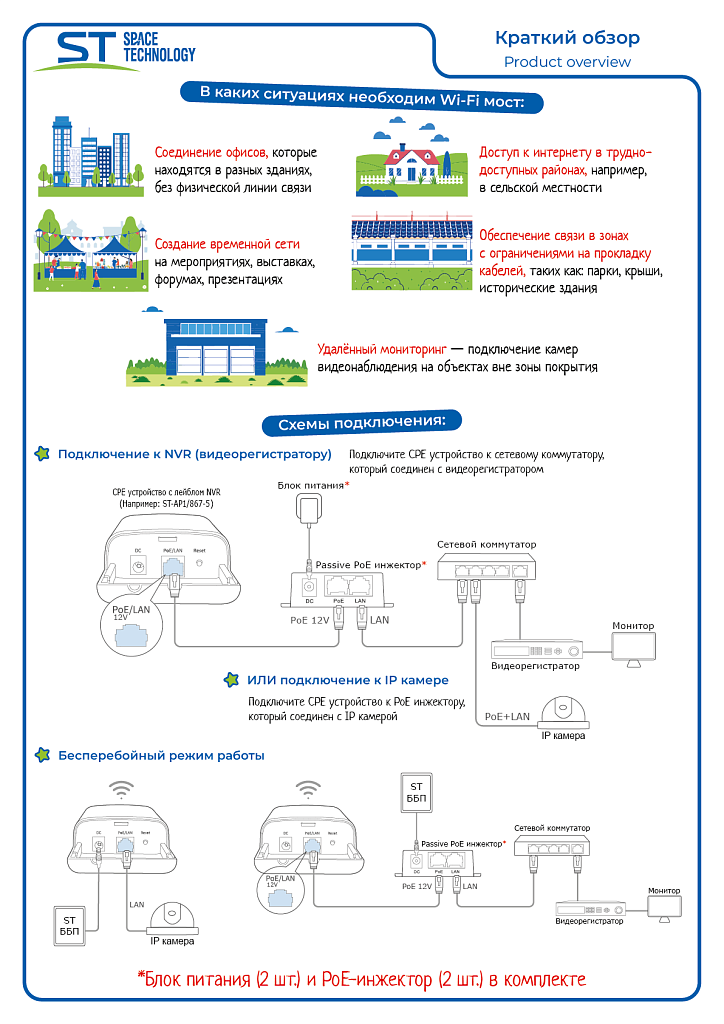 - Комплектность Беспроводная точка доступа - 2шт., адаптер - 2 шт., PoE-инжектор - 2 шт., хомуты для крепления - 4 шт., винты для крепления - 4 шт., паспорт, упаковка
