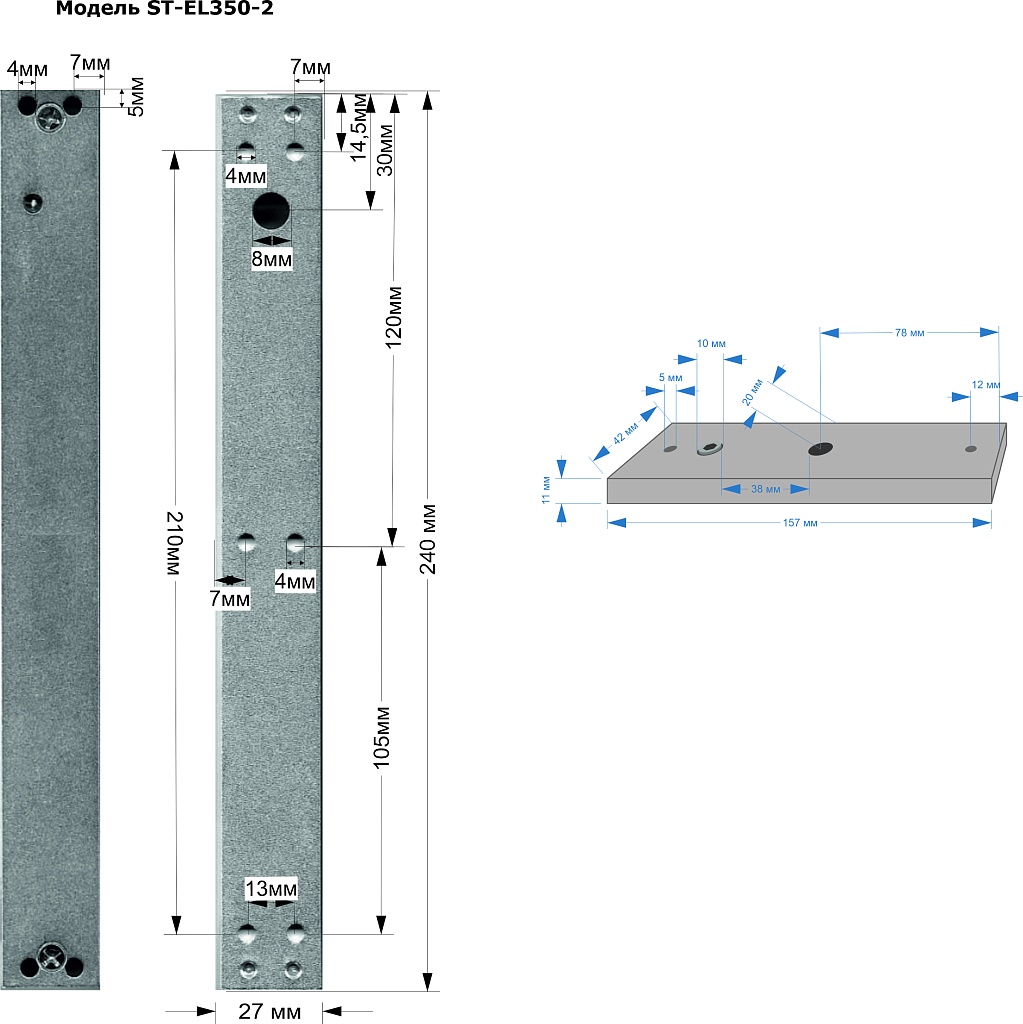 Замок электромагнитный ST-ML350-2, Рабочее напряжение: 12-14В, Ток потребления: 460мА, Сила удержания: 350кг, –40..+50°C, 240*25*50