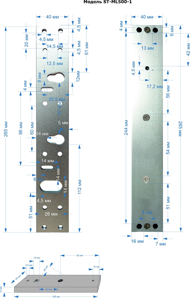 Замок электромагнитный ST-ML500-1, Рабочее напряжение: 12-14В, Ток потребления: 500мАмА, Сила удержания: 500кг, –40..+50°C, 256*40*67
