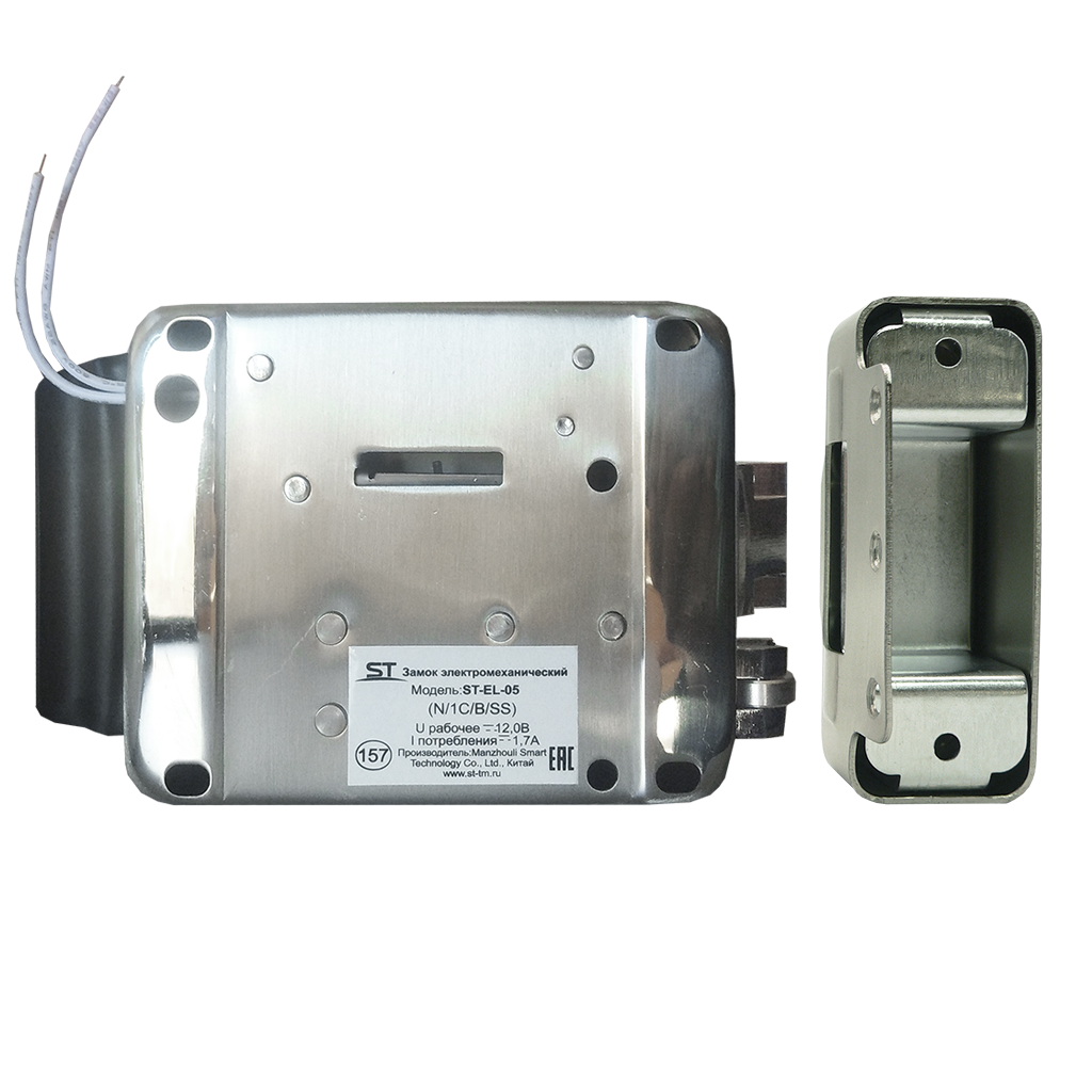 Замок электромеханический ST-EL-05 (N/1C/B/SS), Рабочее напряжение: DC12В±15%, Ток потребления: 1,7А, Время подачи отпирающего сигнала: Не более 1-3сек, Тип цилиндра: одноцилиндровый, Наличие мех.кнопки/возможность блокировки кнопки: да/нет, нержавеющая сталь, Степень защиты: IP55, Цвет: Серебро, –40..+70°С, 125х98х36 мм