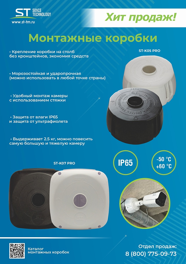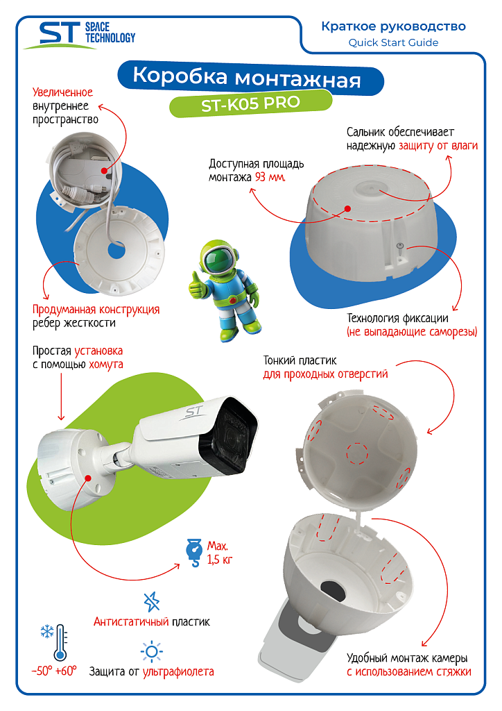 Монтажная коробка ST-K05 PRO (БЕЛАЯ), Универсальная монтажная коробка для видеокамер охранного наблюдения, предназначена для установки и подключения видеокамер охранного видеонаблюдения, Габаритные размеры: 133х60 мм, Максимальная нагрузка: 1,5 кг, Пластик, Цвет: Белая, Рабочая температура: -50…+60°С, Степень защищенности: IP 66, Вес нетто: 0,15 кг, Комплектность: Монтажная коробка, инструкция по эксплуатации, шайба уплотнительная-1 шт., сальник для ввода гофротрубы-1 шт., монтажный комплект-1 шт., саморез (креп.крышки)-4 шт.