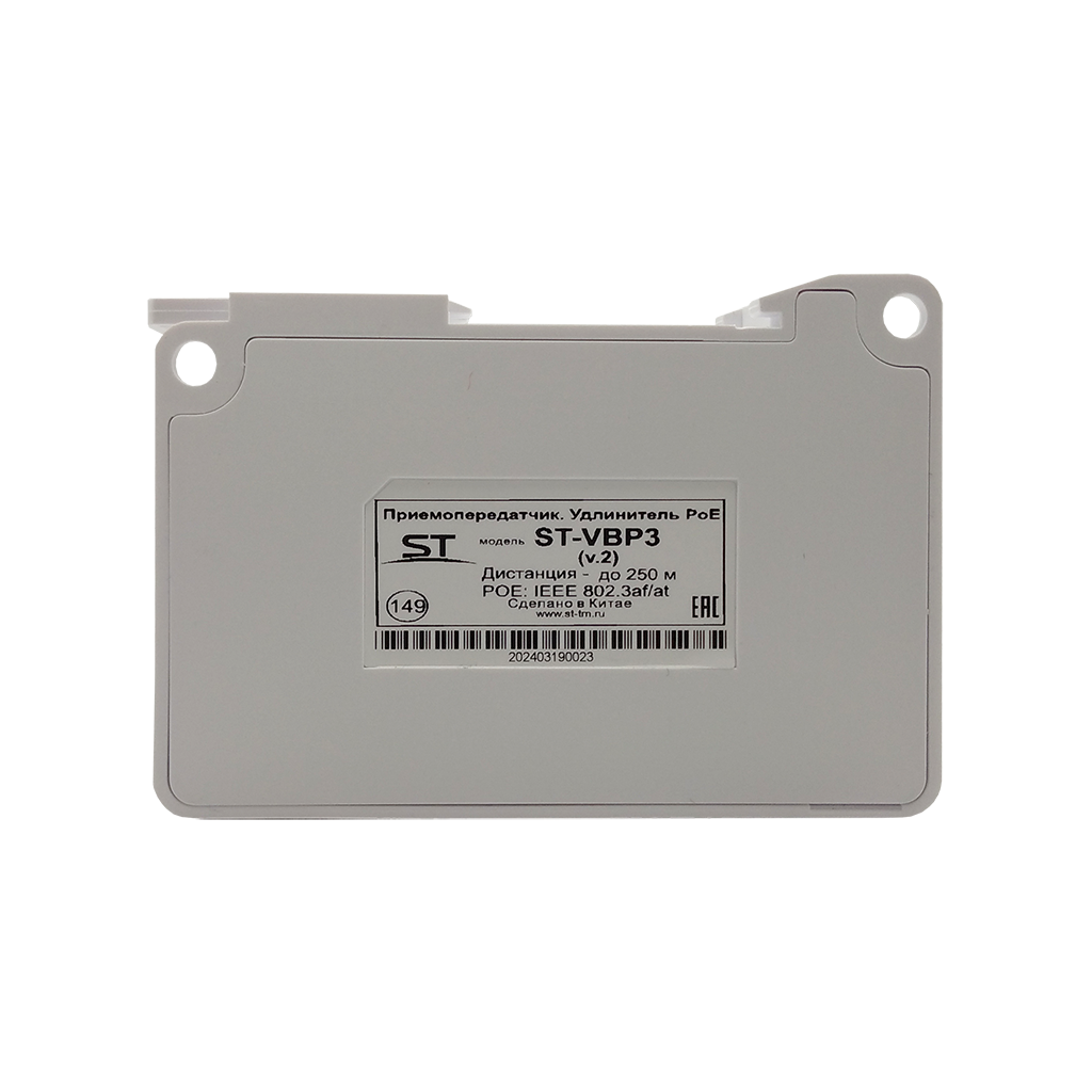 Приемопередатчик ST-VBP3 (версия 2), Удлинитель сигнала по UTP кабелю. Предназначен для приема и последующей передачи данных по проводным UTP линиям связи 5-й и 6-й категории, Порты подключения. Вход: разъем RJ-45 (PoE + Данные) -1 шт, Порты подключения. Выход: разъем RJ-45 (PoE + Данные) – 3 шт, Скорость соединения: 10/100 Мбит/с, Макс. пропускная способность: 100Мбит/с каждый порт, Сетевые стандарты: IEEE 802.3, IEEE 802.3u, IEEE802.3af/at, Потребляемая мощность: 1,2 Вт, Требование к кабелю: 8-жильный кабель категории 5 и выше, Температура эксплуатации: От -45°С до 60°С, Степень защиты: IP54, Тип крепления: DIN-рейка тип "OMEGA", Рабочая влажность: От 5% до 95% (без конденсата), Габаритные размеры ИП: 85мм*58мм*23мм
