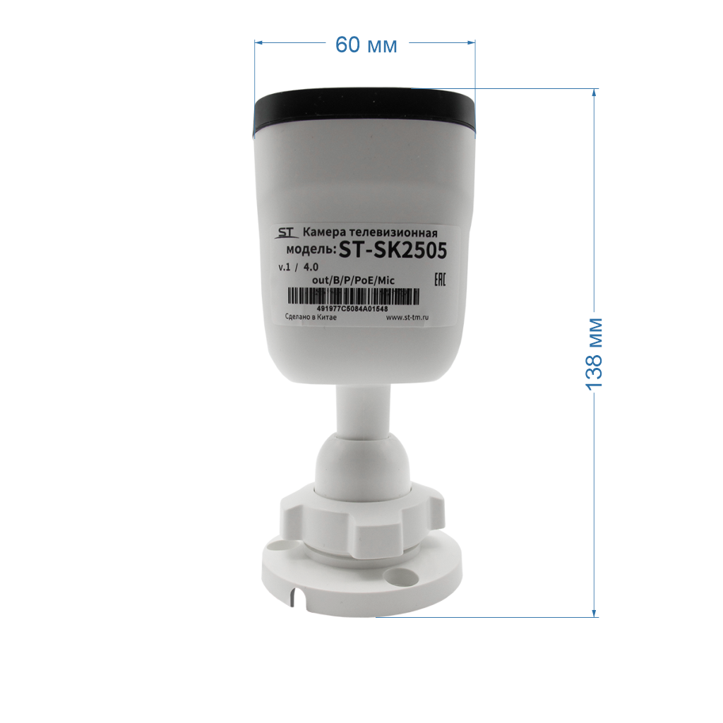 Видеокамера ST-SK2505 TOWN, цветная IP,Разрешение:2,1 Mp (1920*1080), с ИК подсветкой,4 приватные зоны,детектор движения, Цилиндрическая, Фокусн. расст.: 4 мм (Гор.78°/Верт. 44°/Диаг.89°), Сенсор: 1/3" Progressive scan CMOS, Дальн. ИК подсветки: до 30 м, Светочувствит. (мин. освещ.): 0,02 Lux (цвет) / 0 Lux (ч/б c IR), Кодек сжатия: S+265/H.265/H.264, Кодек сжатия аудио: G.711A/G.711U (8Kbps), Аудио вход/выход: Встроенный микрофон/-, PoE: 802.3af (вариант А/В), ИК-фильтр: Механический, Функц. улучш. изобр.: BLC /DWDR /HLC /AGC / 3D-DNR /AWB /MWB/ Антитуман, Smart IR: есть, нет, Кол-во к/с: PAL - 25 к/с NTSC - 30 к/с, Регулир. кронштейна: 3D-Ось, Раб. темп.: -30…+60 С, Степень защищен./вандалостойкость: IP67 / -, Материал корпуса: Пластик