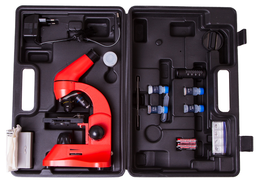 В комплект входит: набор из анатомических срезов растений, в количестве 5 штук, баночки-инкубатории с морскими микроорганизмами, 4-ре ёмкости для суспензий и прочих жидкостей, 2-х кратная линза Барлоу, пинцет, пипетка, микротом, пылезащитный чехол, батарейки, блок питания и инструкция по эксплуатации.