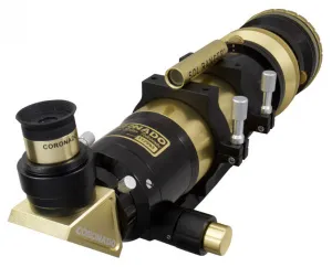 На телескоп установлен солнечный искатель Sol Ranger, фирменная разработка CORONADO. В комплект поставки также включен окуляр Cemax. Он входит в линейку оптических аксессуаров, которые компания разрабатывает специально для солнечных наблюдений. Есть в комплекте и алюминиевый кейс для транспортировки и хранения оптической трубы.