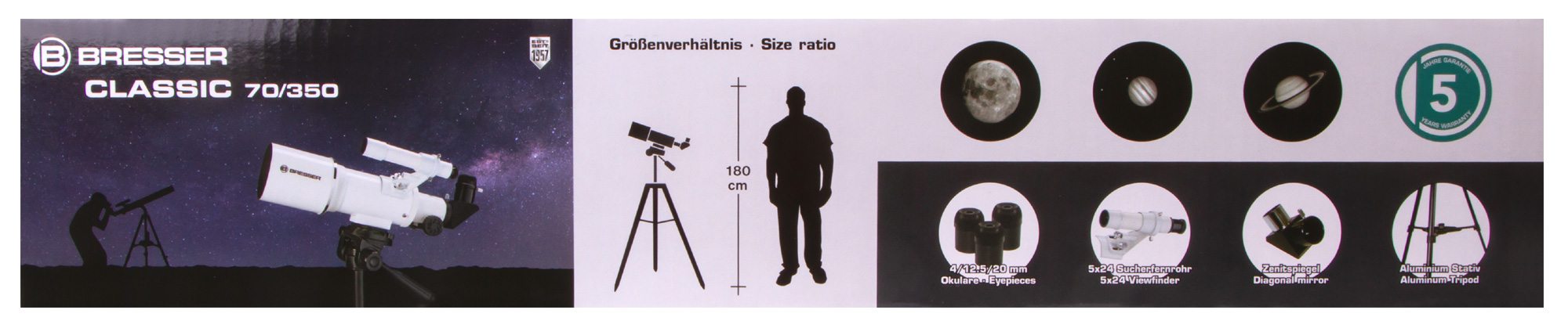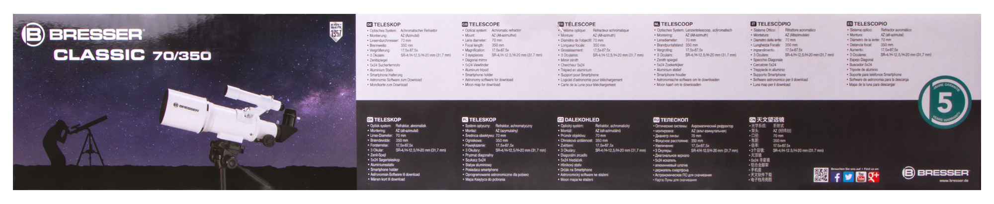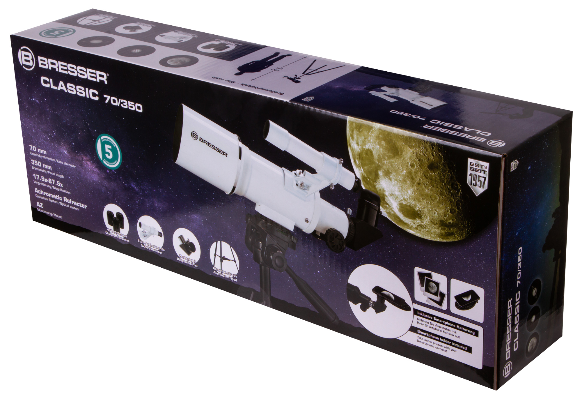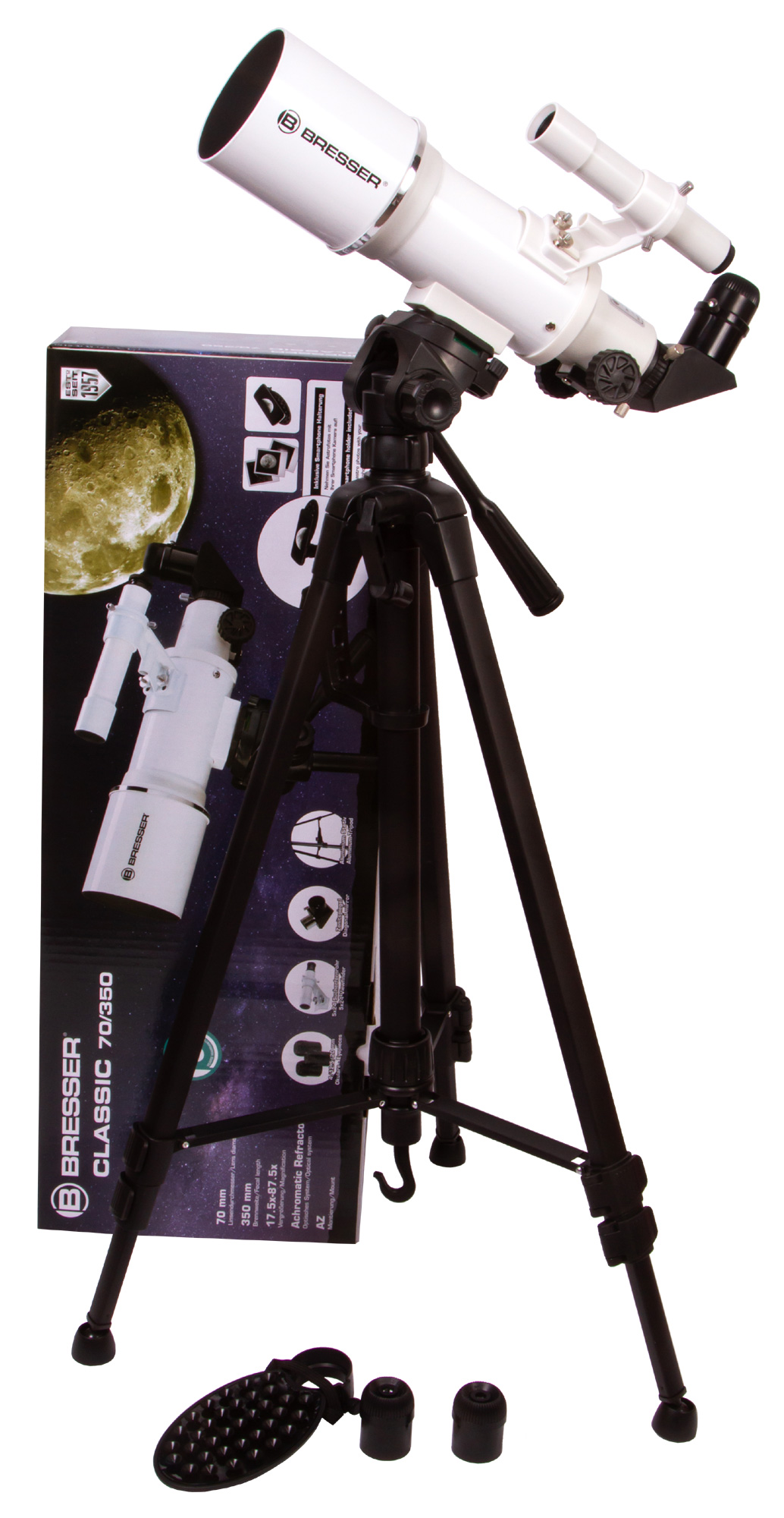 Рефрактор-ахромат Bresser Classic 70/350 AZ – это светосильный оптический инструмент для астрономических наблюдений. Он заинтересует начинающих пользователей, а также тех, кто хочет путешествовать с телескопом. Небольшие размеры и вес позволяют без труда брать этот телескоп с собой на любые астрономические встречи и в загородные поездки. Богатая комплектация избавит от необходимости приобретать дополнительные принадлежности – в комплекте есть даже держатель для смартфона, которой позволит заниматься астрофотографией.